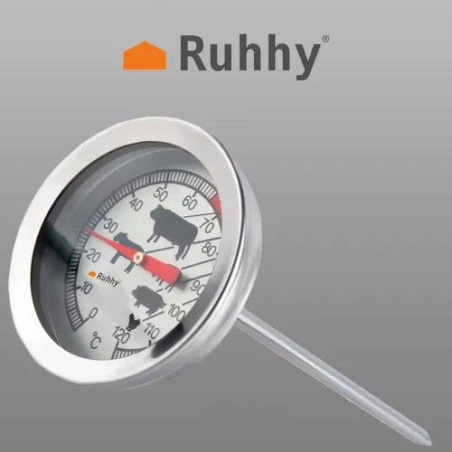 Šķiņķa vārīšanas un kūpināšanas termometrs ar plānu adatas zondi — speciāli izstrādātam gaļas termometram ir plāna zonde, kas viegli iekļūst gaļā, atstājot minimālu atzīmi. Tas ir ideāli piemērots gaļas temperatūras uzraudzībai kūpināšanas procesa laikā. Tāpēc, ja plānojat kūpināt lielākus gaļas gabalus, piemēram, šķiņķi vai bekonu, varat apsvērt mūsu garās zondes termometra izmantošanu, kas var palīdzēt uzraudzīt temperatūru gaļas dziļākajos slāņos. Ēdiena gatavošanai un kūpināšanai — mūsu termometrs ir daudzfunkcionāls un to var izmantot gan gatavošanai šķiņķa gatavotājā, gan kūpināšanai. Jūs tikko esat atradis termometru, kas piedāvā plašu temperatūras diapazonu un precīzus mērījumus. Bezvadu — bezvadu termometrs ļauj uzraudzīt temperatūru no attāluma, kas ir ērti ilgāku kūpināšanas procesu laikā. Skaidrs un praktisks ciparnīca — termometram ir praktiski simboli optimālai kūpināšanas temperatūrai konkrētiem gaļas veidiem (liellopu, jēra, teļa, cūkgaļas un mājputnu gaļa). Ciparnīca ir skaidra, padarot temperatūras nolasīšanu ātru un ērtu. Skala rāda Celsija grādos ik pēc 10 grādiem. Specifikācija — materiāls: nerūsējošais tērauds, citi: stikls + alumīnijs + varš + uzgalis Materiāls: PP, citi: niķelēts dzelzs; Mērījumu diapazons: 0–120 grādi pēc Celsija; zondes garums: 13 cm; izmēri: 5,1 x 14,5 cm; svars: 35 g; svars iepakojumā: 40 g. Specifikācija: Materiāls: nerūsējošais tērauds, citi: stikls + alumīnijs + varš + uzgalis; Materiāls: PP, citi: niķelēts dzelzs; Mērījumu diapazons: 0–120 grādi pēc Celsija; Zondes garums: 13 cm; Izmēri: 5,1 x 14,5 cm; Svars: 35 g; Svars iepakojumā: 40 g; Komplektā iekļauts termometrs; Zondes uzglabāšanas vāciņš; Lielisks analogais termometrs ne tikai kūpinātavām – tam ir plašs pielietojums gastronomijā, gan lietošanai mājās, gan restorānos un pārtikas rūpniecībā. Ar to var viegli pārbaudīt kūpinātas gaļas (vai cita ēdiena) temperatūru, nodrošinot tā izcilo kvalitāti. Termometrs ir izgatavots no nerūsējošā tērauda. Tam ir ļoti praktiski simboli par optimālo kūpināšanas temperatūru konkrētam gaļas veidam. Komplektā ietilpst uzgalis zondes paslēpšanai, ko var izmantot arī tās atbalstam — tam ir praktisks "klips", piemēram, pildspalvai. Brīdinājuma saturs: — lietojiet kā paredzēts. — izvairieties no asu ķīmisku vielu vai abrazīvu sūkļu lietošanas, kas var sabojāt termometra virsmu. — izvairieties no asu instrumentu lietošanas, kas var saskrāpēt vai sabojāt termometra virsmu. — apdegumu un iespējamu ierīces bojājumu riska dēļ glabājiet to bērniem nepieejamā vietā. — mehāniski vai digitāli bojājumi var izraisīt nepareizus mērījumu rezultātus, kas var ietekmēt cepšanas drošību.