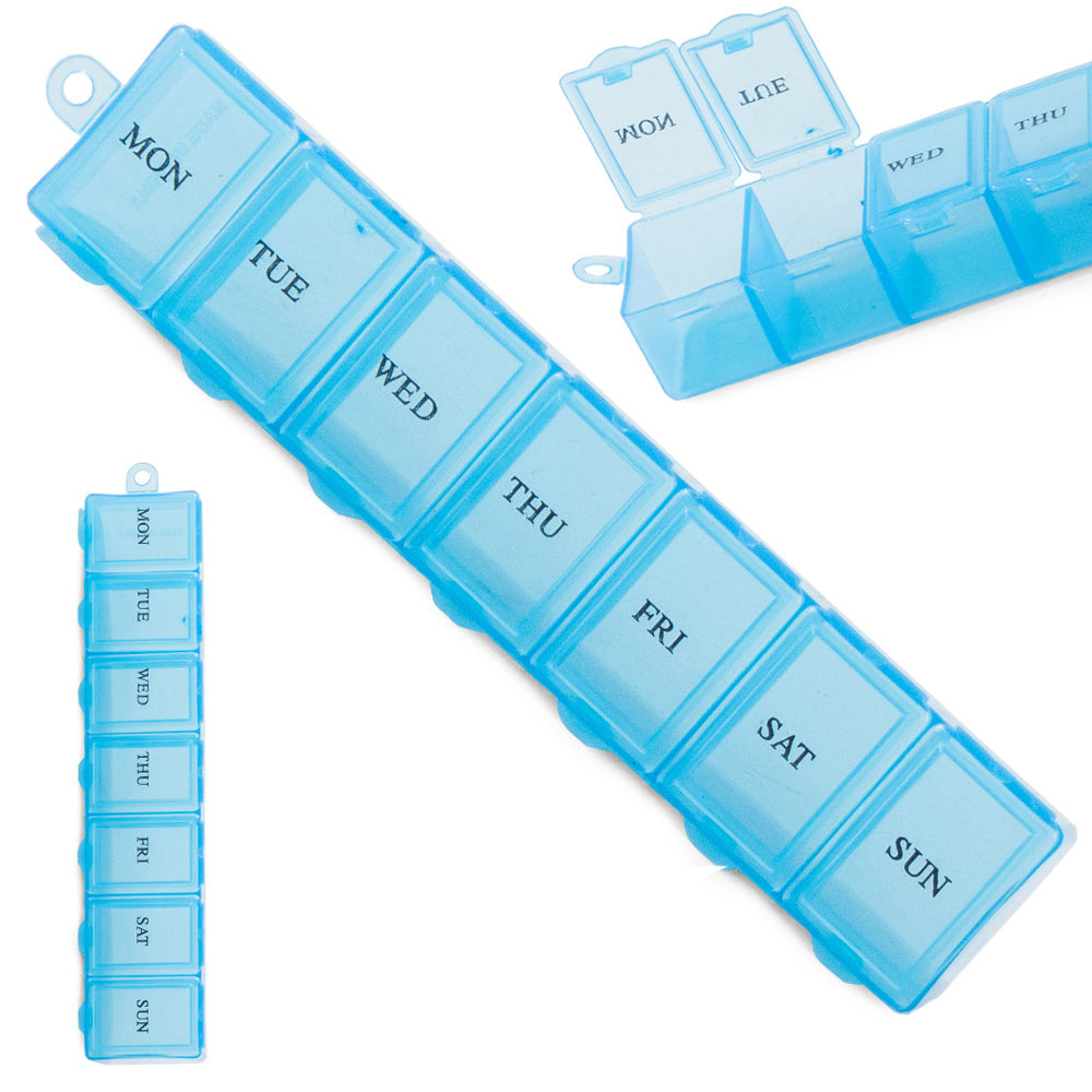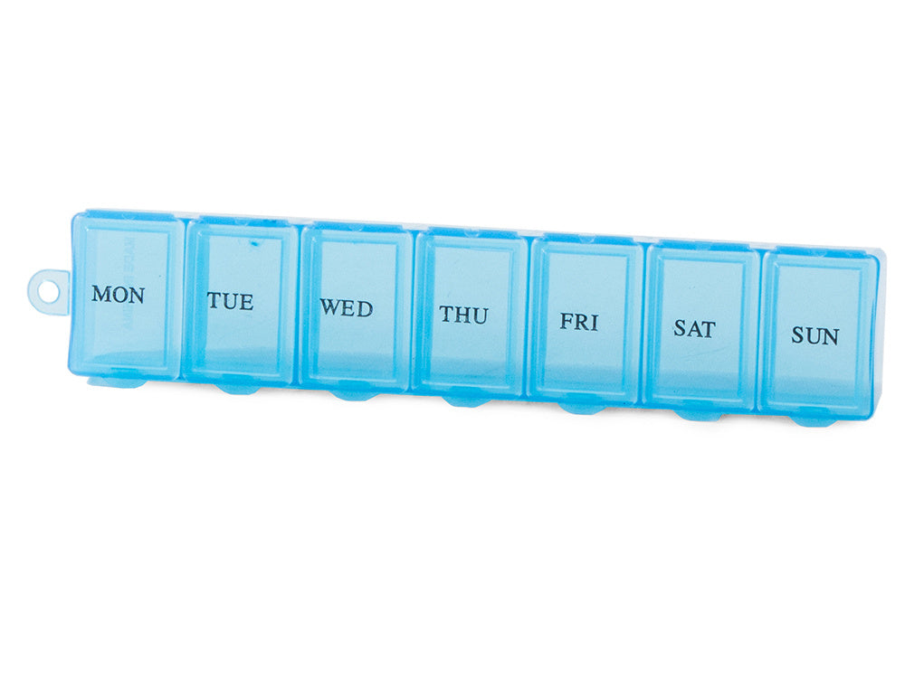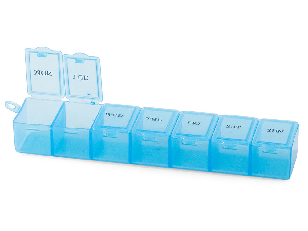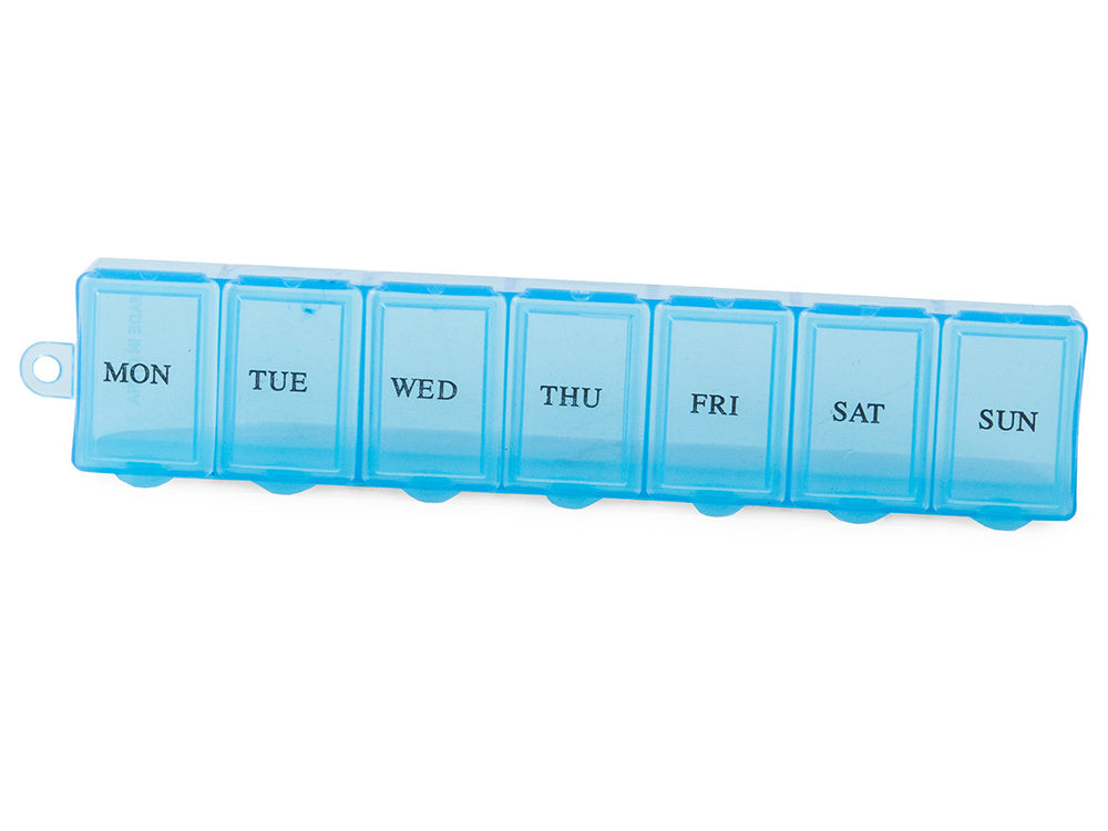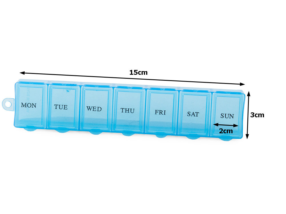 Nedēļas zāļu konteinera kasetes uztura bagātinātāju organizators 7 dienām. Nedēļas zāļu konteiners ir septiņu plastmasas kastīšu komplekts, kas ievietots vienā kopējā kasetē. Ideāli piemērots nedēļas zāļu sagatavošanai, īpaši hroniski slimiem. Vairāku zāļu iepakojumu vietā tās visas var uzglabāt nelielā konteinerā, kas vienmēr ir līdzi. Konteineri ir parakstīti ar nedēļas dienas nosaukumu (angļu valodā). Tehniskās specifikācijas: - augsta - kvalitātes meistarība - septiņi zāļu konteineri katrai nedēļas dienai - katrs konteiners ir parakstīts ar nedēļas dienas nosaukumu - mazs izmērs, ideāli piemērots rokassomiņai, mugursomai - cieši aiztaisāms - kopējais izmērs: - atsevišķa konteinera izmērs: - krāsa: zila. Komplektā ietilpst: - nedēļas zāļu konteiners