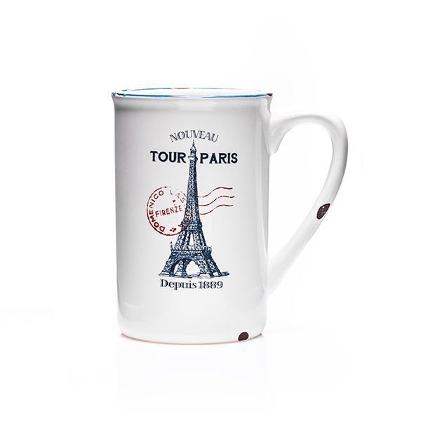 Retro/vintage metāliska krūze ar Eifeļtorni ar "emaljas" apdari. Var mazgāt trauku mazgājamā mašīnā.