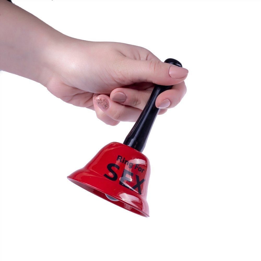 Sarkans metāla zvans ar tekstu "RING FOR SEX". Melns rokturis un teksts. 18+ prece.