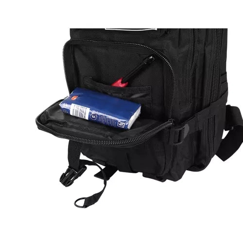 Militārā mugursoma 26 l 26 l - mugursoma sastāv no 5 nodalījumiem. Galvenajam nodalījumam ir rāvējslēdzējs, kas sniedzas līdz pašai apakšai, kas ievērojami atvieglo gan mantu iesaiņošanu, gan izņemšanu. Tajā ir mazāks ar rāvējslēdzēju aizdarāms pārnēsājamais nodalījums un sieta starpsiena. Otrajā lielajā nodalījumā iekšpusē ir dubults mazs pārnēsājamais nodalījums ar piešūtu sietu un 2 nodalījumiem. Ārējais augšējais, mazs pārnēsājamais nodalījums. Ārējais apakšējais, lielāks pārnēsājamais nodalījums - tajā ir dubults mazs pārnēsājamais nodalījums ar piešūtu sietu un 5 nodalījumiem. Mugursomas ārpusē ir nodalījums ar līplenti, kas ir lieliski piemērots hidratācijas sistēmas - dzeramā ūdens - nēsāšanai. Ātrās atbrīvošanas mugursomas sistēma - mugursomai ir nēsāšanas sistēma, kas sastāv no profilētām plecu siksnām ar ātrās atbrīvošanas sprādzēm, tas ir praktisks risinājums un tiek izmantots, lai nekavējoties noņemtu mugursomu. Stabilu nēsāšanu nodrošina profilēto plecu siksnu, krūšu siksnas un noņemamas gurnu jostas vienmērīga regulēšana - josta ļauj atslogot mugurkaulu un plecus, valkājot mugursomu - viss svars ir koncentrēts uz gurniem. Mugursomas priekšpusē un plecu siksnās tiek izmantotas Pals lentes, kas ļauj piestiprināt aprīkojumu Molle sistēmā — tas ļauj uzstādīt papildu pārnēsājamos priekšmetus. Pilnīga regulēšana — sānu sienām, mugursomas apakšdaļai un augšdaļai ir regulējama siksna, kas piestiprināta ar sprādzi — to izmanto, lai saspiestu mugursomu. Mugursomas siksnu saīsināšana ļauj to saplacināt, piem., kad galvenais nodalījums ir praktiski tukšs un piepildīti tikai mazākie pārnēsājamie priekšmeti. Regulējamas siksnas var būt noderīgas arī, nostiprinot pārnēsājamo aprīkojumu, piem., guļampaklājiņu, telti utt. Stingrība — muguras un plecu siksnas ir pastiprinātas, pārklātas ar sietu, kas ļauj gaisam izplūst, kas arī lielā mērā slāpē vibrācijas — tas ir īpaši svarīgi garu ekspedīciju laikā. Mugursoma ir izgatavota no izturīga, ūdensnecaurlaidīga materiāla, kas ir izturīgs pret plīsumiem un nodilumu. Iekšpusē tā ir pārklāta ar gumiju, kas pasargā to no ūdens iekļūšanas. Specifikācija — materiāls: neilons, poliesters 600d; tilpums: 26 l; izmēri (garums, platums, augstums): 44x28x16 cm; Svars: 0,470 kg, svars iepakojumā 0,480 kg Specifikācija Krāsa: melna Materiāls: neilons Poliesters 600d Tilpums: 26 l Izmēri (garums/augstums): 4486 cm Svars: 0,470 kg Svars iepakojumā: 0,480 kg Iekļauts mugursomas uzšuvums - bezmaksas Militārā izdzīvošanas mugursoma ar 26 l ietilpību ir modelis, kas nodrošina perfektu piegulumu ikvienam! Tā ir ideāli piemērota kalnu braucieniem, bet ne tikai mugursoma ir piemērota arī ikdienas lietošanai, piemēram, skolai. Tā ir izgatavota no izturīga, ūdensnecaurlaidīga materiāla, kas ir izturīgs pret plīsumiem un nodilumu. Mugursomai ir rokturis, kas ļauj to ērti nēsāt.