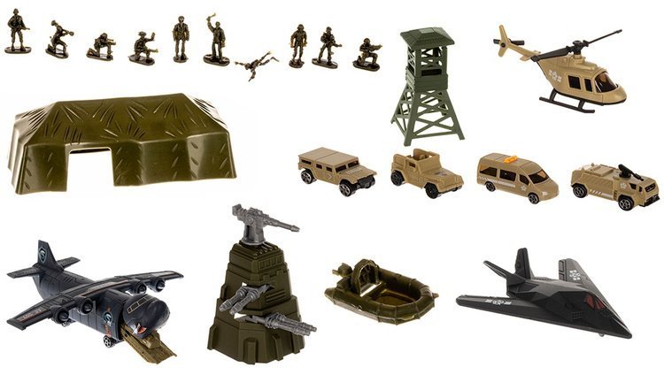 lidmašīnām, kravas automašīnām, rotaļu karavīriem, ēkām un ceļa zīmēm. Tam pat