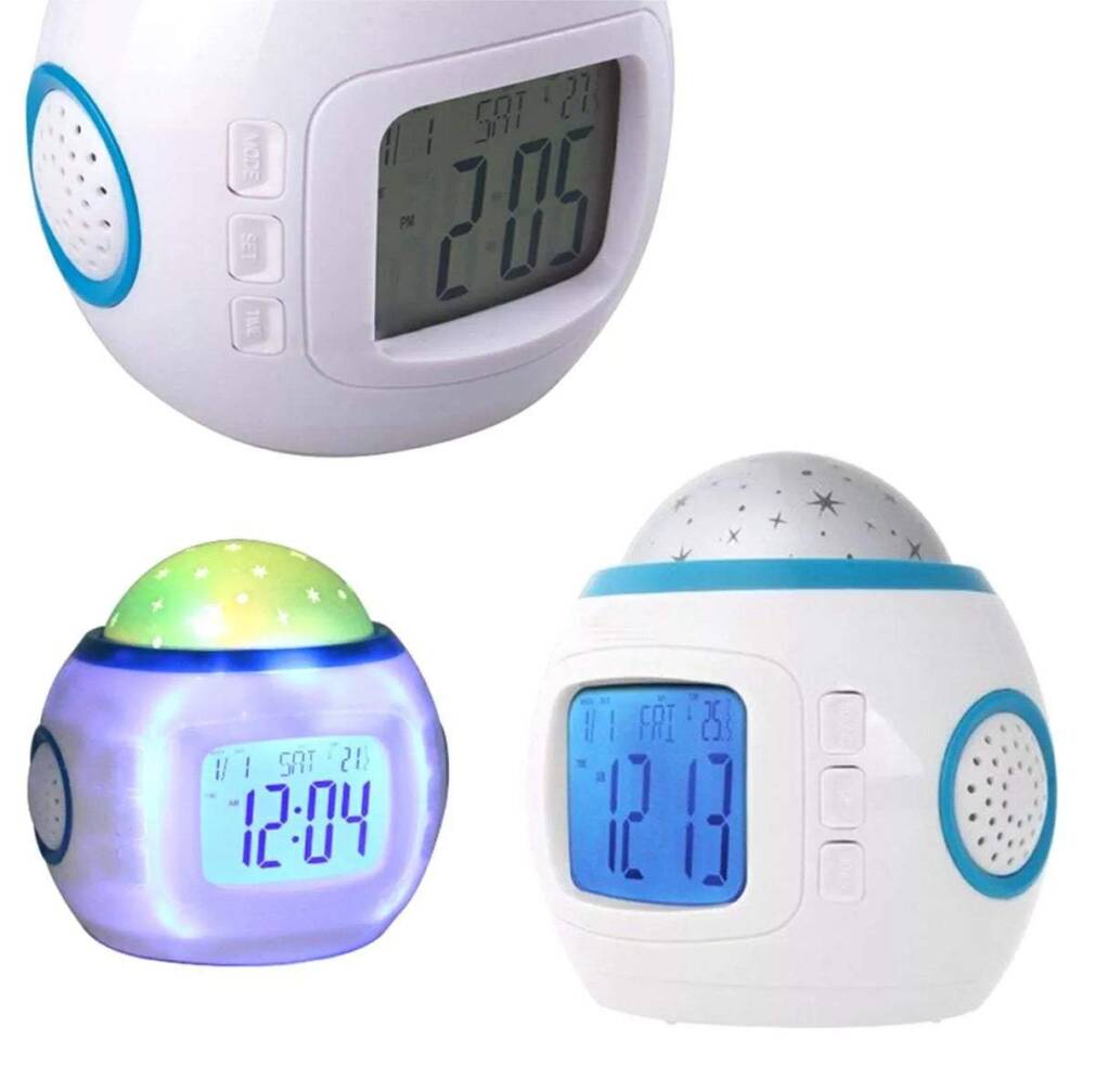 • Modinātājs ar krāsainu zvaigžņoto debesu projekciju telpā, kas mainās atskaņotās melodijas ritmā.