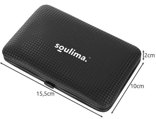 Nagu aksesuāru instrumentu kaste no volframa tērauda – tai piemīt labākās īpašības starp visiem tērauda veidiem. To raksturo liela izturība, tas ir noturīgs pret nodilumu, matēšanos. Tas nesaskrāpējas un nedeformējas. Turklāt tas ir hipoalerģisks, tāpēc, nonākot saskarē ar ādu, neizraisa alerģiju. Pilns komplekts katrai situācijai – komplektā ir 16 elementi. Koferis + 15 instrumenti; roku, kāju un sejas kopšanai. Zemāk ir detalizēts instrumentu saraksts. Universāls lietojums – tas lieliski darbosies gan nagu salonā, gan mājās. Tas noteikti pildīs savas funkcijas estētiskajā medicīnā, skaistumkopšanas salonos un spa. Koferis – viss ir ievietots elegantā koferī ar spiedpogu. Iekšpusē ir paredzētas vietas katram instrumentam. Praktisks komplekts, kas vienmēr ir pa rokai! Tas ir arī lieliski piemērots ceļojumiem, nav riska, ka tas atvērsies un sabruks. Specifikācija – aksesuāru materiāls: volframa tērauds; kofera materiāls: PU; kofera izmēri (garums/augstums): 15,50 cm; komplekta svars: 0,217 kg; svars ar iepakojumu: 0,219 kg. Specifikācija Piederumu materiāls: volframa tērauds Korpusa materiāls: poliuretāns Korpusa izmēri (garums/augstums): 15,50 cm Komplekta svars: 0,217 kg Svars ar iepakojumu: 0,219 kg Komplektā iekļauts maciņš Pincete Kutikulas stūmējs Lielas nagu šķēres Šķēres Kutikulas knaibles Mazas nagu šķēres Leņķiskas nagu šķēres Nagu vīle Kutikulas trimmeris Tīrīšanas nazis x2 Skrāpis x2 Ierīce Melno punktu un strutainu plankumu noņemšanai Ausu tīrīšanas karote