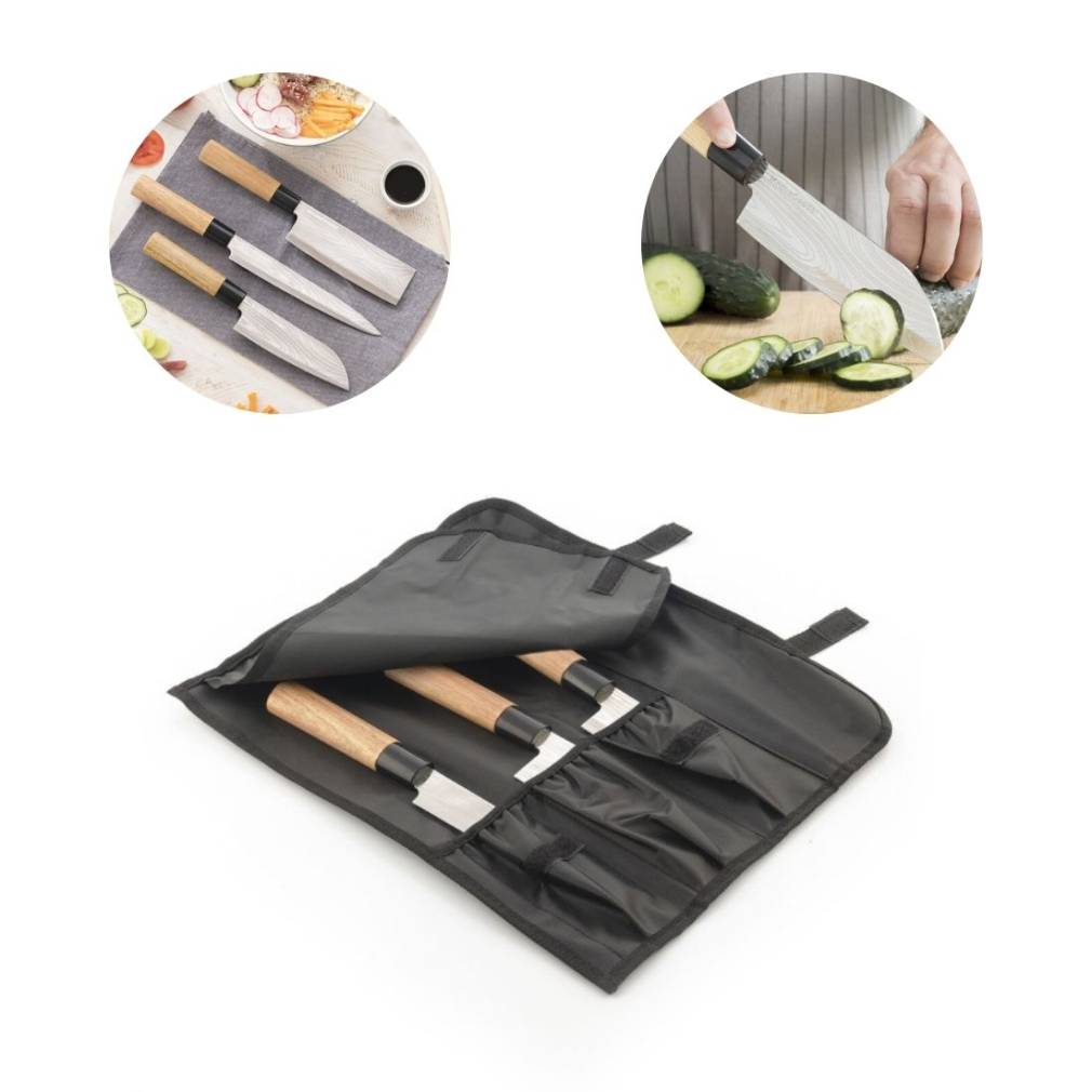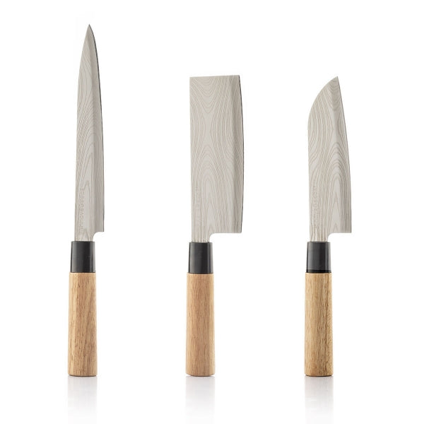 * Satur trīs nažus (fileja, cirvis un santoku)
