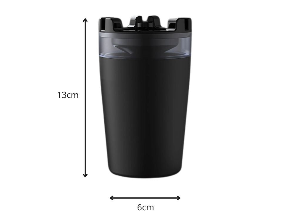 Pelnutrauks krūzīšu turētājs automašīnai mājās ar cigarešu dzēšamo aparātu krūzīšu turētāja grozu. Funkcionālais pelnutrauks krūzīšu turētāja formā ir ideāls risinājums smēķētājiem, kuri novērtē kārtību un ērtības. Pateicoties kompaktajiem izmēriem un universālajai formai, pelnutrauks lieliski iederas jūsu automašīnas krūzīšu turētājos un ir ideāli piemērots lietošanai mājās vai birojā. Iebūvētais cigarešu dzēšamais aparāts ļauj ātri un droši nodzēst ogles, samazinot nekontrolētas dūmu vai smakas izplatīšanās risku. Vienkārši atvienojiet aizbāzni un piepildiet ar ūdeni. Tas ir praktisks un estētiski pievilcīgs aksesuārs gan automašīnā, gan stacionārām vajadzībām. Ideāli piemērots cilvēkiem, kuri vēlas uzturēt savu apkārtni tīru un kārtīgu neatkarīgi no atrašanās vietas. Lieliska dāvanas ideja smēķētājam, kurš novērtē funkcionalitāti un stilu. Tehniskās specifikācijas: - augstas kvalitātes izgatavošana - hermētisks trauks - cigarešu dzēšamais aparāts uz ūdens bāzes - labi darbojas kā neliela atkritumu tvertne - izmēri: - krāsa: melna. Komplektā ietilpst: - pelnutrauks