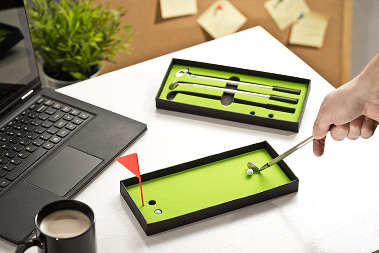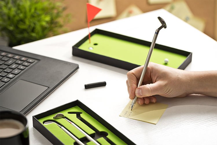 Mūsu golfa pildspalvu komplektā ietilpst 3 matēta sudraba toņa nūjas, kas veidotas kā pildspalvas, dzelzs gumijas vāciņi, kas atdarina rokturus. Divas mini golfa bumbiņas, karogs un grīns komplektā ar divām bedrītēm un caurumu karoga izlikšanai. Pildspalvas ir 7 collu.
