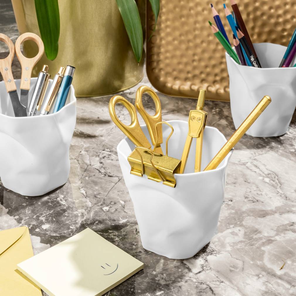 Sakārtojiet savu darbvirsmu vai vannas istabas plauktu, izmantojot mūsu modernos pildspalvu turētājus, kas izskatās kā sasista plastmasas krūze. Tie ir arī ideāli stādītāji :) Funkcijas: - jauks izskats un amp; modernas pildspalvas un vannasistabas lietu turētājs - lieliski piemērots arī moderniem stādītājiem - 3 gab. komplekts - izmantojiet, lai turētu zīmuļus, šķēres, galda piederumus vai zobu pastu un zobu birstes - un arī jūsu augu podiem - materiāls: plastmasa - jauka dāvana daudziem gadījumiem