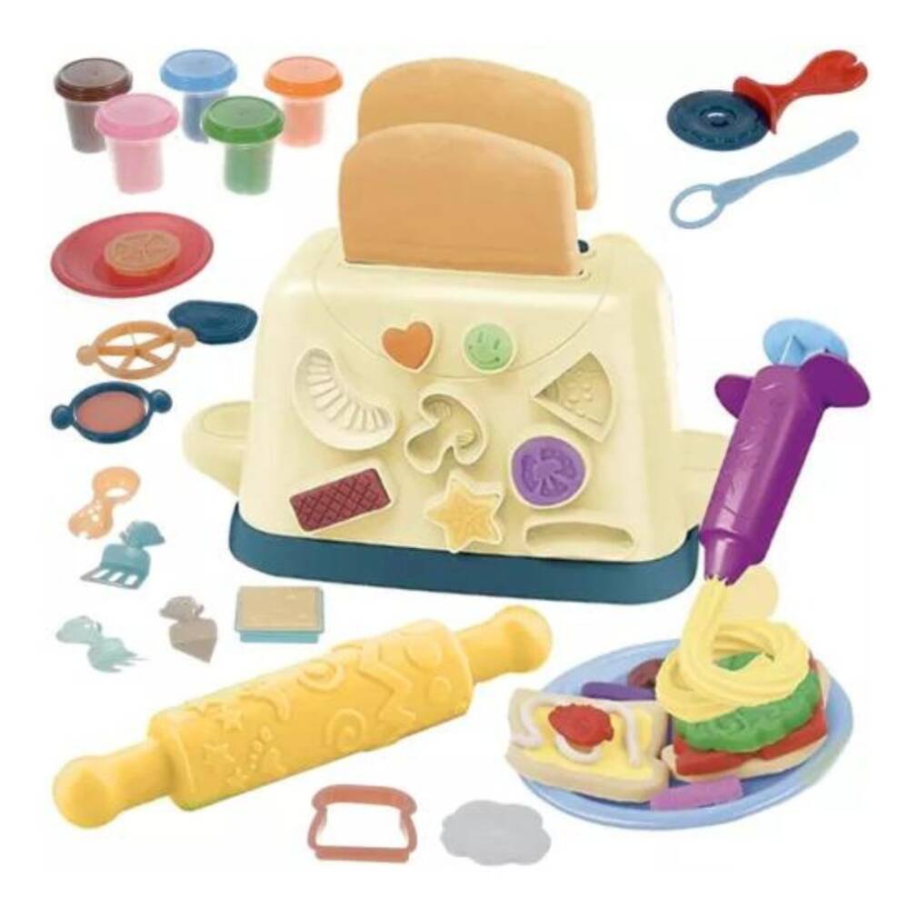 Šajā komplektā ietilpst tosteris un daudz citu piederumu, ko jūsu bērns var izmantot, lai no plastelīna izveidotu dažādus priekšmetus.
