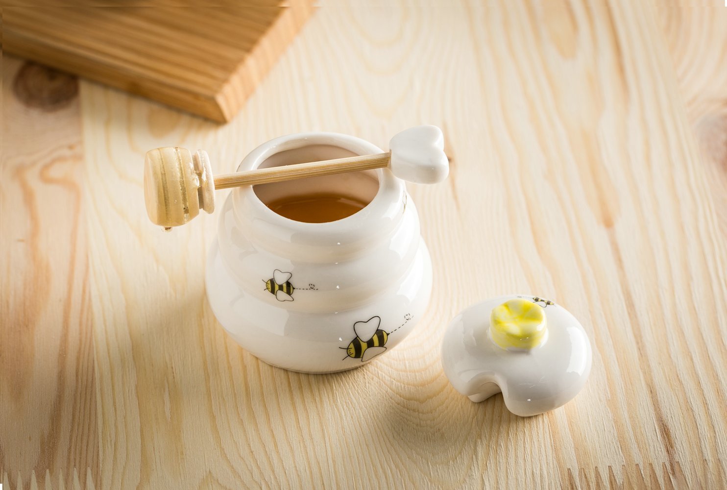 Skaisti keramikas medus pods komplektā ar koka mērci. Lieliska maza dāvana daudziem gadījumiem. Kā dāvana kāzām, dzimšanas dienas dāvana, Mātes dienas dāvana - mūsu unikālā mazā dāvana. Keramikas medus pods "Meant to Bee" ir garšīgi salds no iekšpuses un ārpuses, tāpēc tas lieliski papildinās jūsu svētkus! Dzeltenmelnās bitītes tuvina šo kāzu balto, bišu stropa formas medus podu — šī ir šarms un praktiskums. Vāciņā ir iecirtums, kur balta, pirkstgala izmēra, keramikas sirds, kas piestiprināta pie koka kausa, nodrošina vieglu piekļuvi zelta dārgumam, kurā iebērs jūsu viesi. Jauki mīļi! Funkcijas: - porcelāna medus pods - brīnišķīgs pods caurspīdīgā dāvanu kastītē ar krāšņu pasteļpurpursarkanu, rozā un zilu ziedu dārzu apakšā - izcelts ar sajūsmotu bišu pāris starp vārdiem "Domāts bitei" un "Medus pods ar Lācis." - balta organzas lente un bantīte, kā arī zieda formas birka "Jums" padara šo labvēlību par skatu uz bišu turēšanu - podiņa izmērs: 7,62 x 6,98 cm - materiāls: skaista gluda keramika