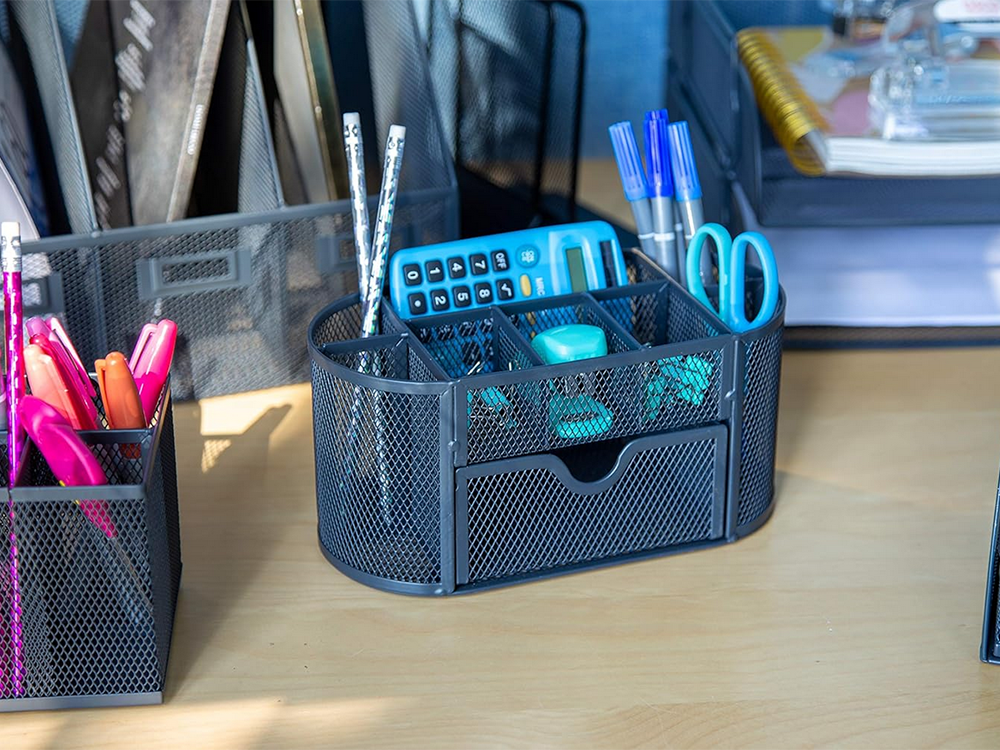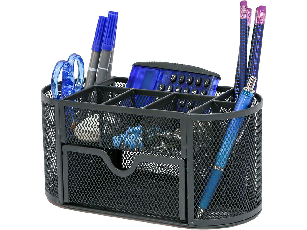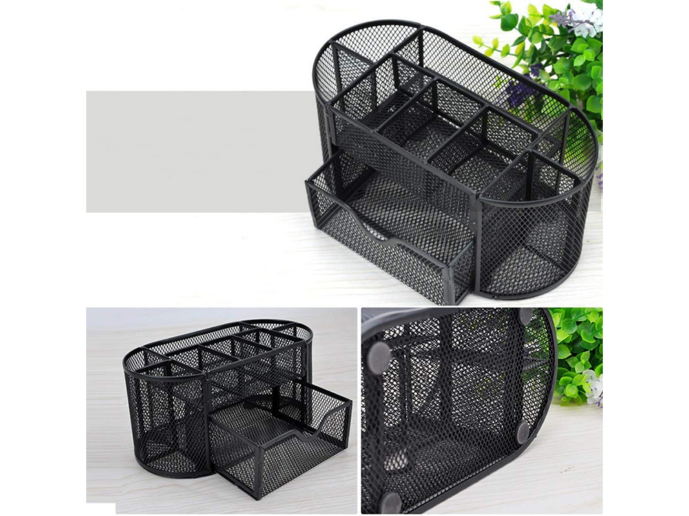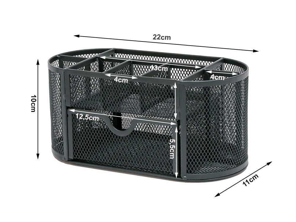 Galda organizators ar 8 nodalījumu atvilktnēm, metāla sieta, melns galda organizators ar fona apgaismojumu, smags metāla sieta konstrukcija, piemērots mājām, birojam utt. Tajā var uzglabāt svarīgākos skolas un biroja piederumus: saspraudes, līmi, šķēres, pildspalvas, krītiņus, marķierus, dzēšgumijas, piezīmju kartītes. Instrumentu kaste ir ļoti ietilpīga. Daudzos nodalījumos un izvelkamā atvilktnē var ievietot visus nepieciešamos darba piederumus, lai uzturētu kārtību darba vietā. Organizators ir aprīkots ar neslīdošām kājiņām, lai novērstu konteinera kustību. Tehniskās specifikācijas: - materiāls: lakots metāls, metāla siets - neslīdošas kājiņas - izvelkama atvilktne maziem piederumiem - pildspalvām, marķieriem utt. - o-veida forma - krāsa: melna izmēri: - augstums: - platums: - dziļums: - atvilktnes platums: Komplektā ietilpst: - galda organizators