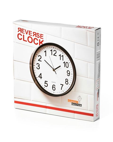 Šis neparastais pulkstenis darbojas otrādi! Izmērs ir aptuveni 30 cm diametrā. Pulksteņa ciparnīca aizsargāta ar stiklu.