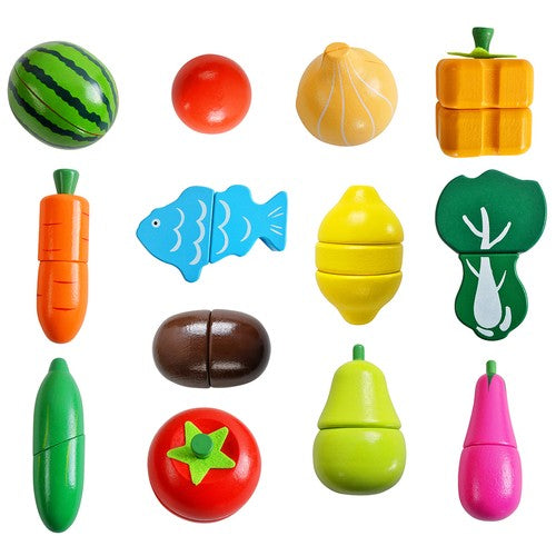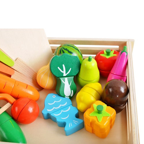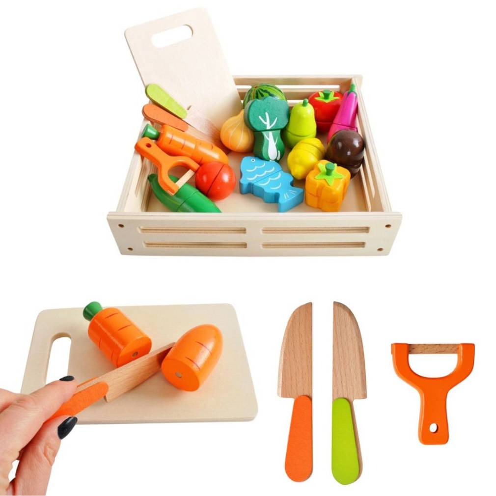Šo produktu sauc par koka dārzeņiem ar piederumiem kastē. Tā ir 34 dažādu augļu