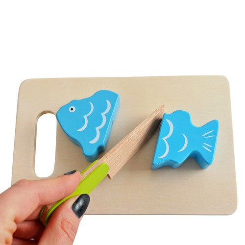 ietilpst divi izlikti naži, mizotājs un dēlis griešanai. Rotaļu komplektam ir