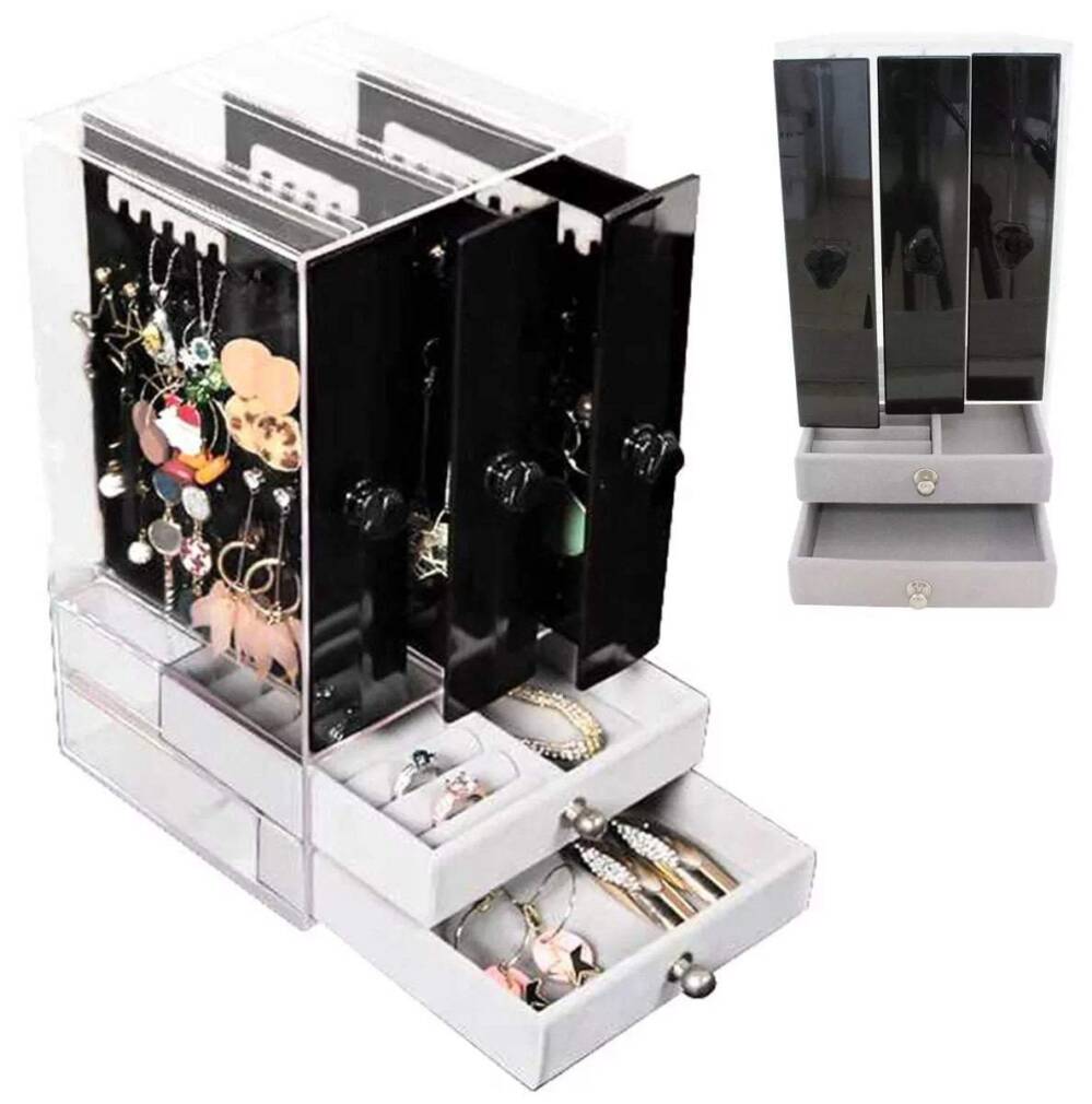Praktisks juvelierizstrādājumu organizators ar trim izvelkamām atvilktnēm, kas ļauj vertikāli piekārt rokassprādzes vai auskarus. Tam ir arī divas papildu atvilktnes apakšējā daļā. Rotu statīvs ir nepieciešams ikvienai sievietei, kura vēlas sakārtot savu aproču, pulksteņu un citu rotu kolekciju un uzglabāt tās estētiskā veidā. Tāpat lieliski derēs uz visām izstādēm un skatlogiem, pie juveliera vai lombardā.