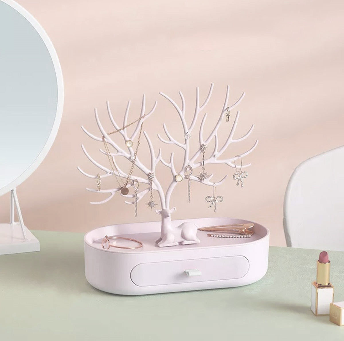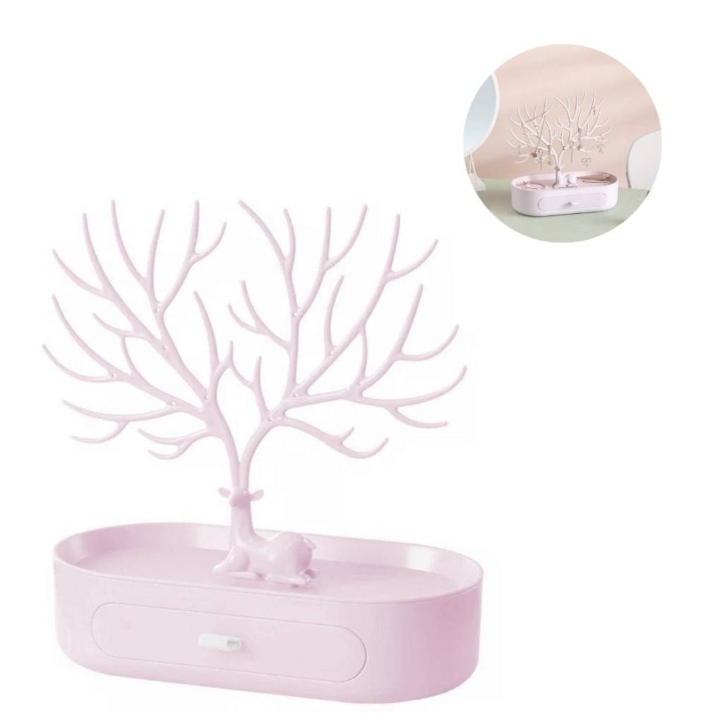 Jūsu jaunais rotu statīvs piesaistīs uzmanību! Tam ir koka forma un briežu ragi. Neskatoties uz detalizēto dizainu, tas ir ļoti viegls un viegli pārvietojams. Tam ir liela pamatne un daudz zariem līdzīgu turētāju, lai visas jūsu rotaslietas būtu sakārtotas. Pamatnē ir pat iebūvēta slepena atvilktne.