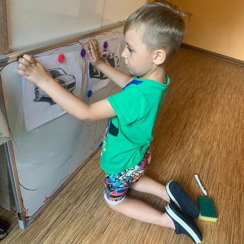 Magnētiskā tāfele ar dzēšamo rakstu 90 x 60 cm + marķieri, magnēti un sūklis ar dzēšamo rakstu + sūklis - tāfele ļauj rakstīt un zīmēt ar speciāliem marķieriem. Komplektā ietilpst 4 krāsaini marķieri: 2 melni, 1 sarkans un 1 zils. Lai nodzēstu marķierus, izmantojiet sūkli, ko saņemsiet kopā ar tāfeli. Sūklim ir iebūvēts magnēts, lai to varētu viegli piestiprināt pie tāfeles! Daudzfunkcionālas - tāfeles ar dzēšamo rakstu ir daudzfunkcionālas un tās var izmantot dažādiem mērķiem, piemēram: piezīmju veikšanai, diagrammu veidošanai, prezentāciju vadīšanai, matemātikas apguvei, zīmēšanai, gleznošanai un daudziem citiem mērķiem. Piekaramie kronšteini vertikālai un horizontālai pakarināšanai - tāfeli var pakārt vertikāli vai horizontāli. Tāfelei ir divi rokturi katrā pusē. Jūs varat pielāgot tās platumu pēc savas patikas. Plaukts tāfeles piederumiem - šīs tāfeles papildu priekšrocība ir plaukts piederumiem. Uz tā var novietot marķierus, sūkļus vai magnētus. Tāfelei pievienojam 10 krāsainus magnētus, kas noderēs karšu ar svarīgu informāciju vai zīmējumiem turēšanai. Specifikācija - materiāls: ar dzelzi pārklāts kartons, citi elementi: alumīnija sakausējums + magnēts + 4 gab. marķieri; izmēri: 60 x 90 cm; svars: 1,585 kg; svars iepakojumā: 2,687 kg. Komplekta specifikācija: materiāls: ar dzelzi pārklāts kartons, citi elementi: alumīnija sakausējums + magnēts krāsa: balta magnētisks: jā izmērs: 60 x 90 cm svars: 1,585 kg iepakojuma svars: 2,687 kg komplektā iekļauta tāfele 4 marķieri: 2 x melni, 1 x zili, 1 x sarkani 10 magnēti 1 magnētiskais sūklis sausās dzēšanas tāfele ir tāfeles veids, kas īpaši paredzēts rakstīšanai ar speciāliem sausās dzēšanas marķieriem un ir viegli tīrāms ar sūkli. Tās bieži izmanto tādās vietās kā skolas, biroji, konferenču telpas, kā arī mājās un citās vietās, kur nepieciešama rakstīšanas un zīmēšanas virsma, ko var ātri notīrīt. brīdinājuma saturs: - tīriet tāfeli ar sausu, mīkstu drānu vai sūkli, kas paredzēts sausās dzēšanas tāfelēm. ieteicams regulāri tīrīt virsmu, īpaši pēc ilgstošas lietošanas. - tāfeles tīrīšanai neizmantojiet ķīmiskas vielas vai asus instrumentus, lai nesabojātu sausās dzēšanas pārklājumu. - bērniem ieteicams lietot tāfeli pieaugušo uzraudzībā, īpaši rakstot un tīrot, lai izvairītos no saskares ar tīrīšanas līdzekļiem vai nejaušas virsmas sabojāšanas. - pēc biežas sausās dzēšanas marķieru lietošanas, īpaši slikti vēdināmās telpās, var parādīties putekļu vai izgarojumu paliekas. - ieteicams telpu izvēdināt vai izmantot marķierus bez smaržas.