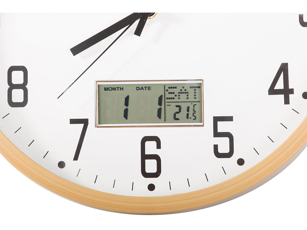 Sienas pulkstenis, liels, kluss 30 cm apaļš rādītājs, datums, temperatūra, sekundes ✔ Klasiskais rādītājpulkstenis ir brīnišķīgs papildinājums mūsu mājām. Pateicoties tā izmēram, to var nolasīt no liela attāluma. Tas ir ideāli piemērots virtuvei, guļamistabai, vannas istabai vai viesistabai. Tas atradīs savu pielietojumu arī birojā vai skolā. ✔ Klusa kustība - bez tikšķēšanas! Klusa, vienmērīga kustība - bez skaļas tikšķēšanas skaņas, padarot šo pulksteni ideāli piemērotu guļamistabai, kabinetam, bērnu istabai vai birojam. Vienmērīga sekunžu rādītāja kustība - garantē precizitāti un komfortu. Ilgāks akumulatora darbības laiks - pateicoties enerģiju taupošajai operētājsistēmai. ✔ Pulksteņa lietošanas piemērs ⭐ Dzīvojamā istaba - kā stilīgs dekoratīvs elements, kas papildinās interjeru un sniegs ērtu laika pārskatu. ⭐ Guļamistaba - pateicoties klusajam kvarca mehānismam, tas netraucē miegu ⭐ Bērnu istaba - laika lasīšanas apguve analogajā un digitālajā pulkstenī. ⭐ Virtuve - atvieglo laika uzskaiti ēdiena gatavošanas laikā, un papildu termometrs palīdz kontrolēt temperatūru telpā. ⭐ Birojs - atvieglo laika pārvaldību un uzdevumu plānošanu. ⭐ ārsta kabinets — noderīgs temperatūras kontrolei un kā instruments tikšanos plānošanai. ⭐ uzgaidāmā telpa — ļauj klientiem un pacientiem kontrolēt gaidīšanas laikus. ⭐ skola un universitāte — ideāli piemērots lekciju zālēm un auditorijām, kur salasāmība un papildu funkcijas ir liela priekšrocība. ? tehniskās specifikācijas: - materiāls: plastmasa - estētisks dizains - klusa mehānisma darbība - sekunžu rādītājs — caurspīdīgs - viegli saliekams - ir āķis pakarināšanai, piemēram, pie sienas - cipari: romiešu cipari - digitāls datuma un temperatūras displejs - barošanas avots: baterijas 1 x AA, 1 x AA (nav iekļauts komplektā) - krāsa: brūna ? izmēri: - pulksteņa diametrs: - ciparnīcas diametrs: - digitālā displeja izmēri: ? pulksteņa iestatīšana analogā laika iestatīšana: ⭐ ievietojiet AA bateriju pulksteņa mehānismā. ⭐ pagrieziet ciparnīcu uz aizmugurējā korpusa, lai iestatītu pareizo laiku. ⭐ pārliecinieties, vai rādītāji ir labi izlīdzināti, un piekariet pulksteni pie sienas. LCD displeja iestatīšana: ⭐ ievietojiet displeja barošanas nodalījumā AAA bateriju ⭐ nospiediet iestatīšanas pogu, lai piekļūtu iestatījumiem. ⭐ izmantojiet augšup/lejup vērstās bultiņas, lai iestatītu nedēļas dienu, datumu un displeja formātu (12/24 h). ⭐ apkārtējās vides temperatūra tiek automātiski mērīta un parādīta ekrānā. ? Komplektā ietilpst: - sienas pulkstenis