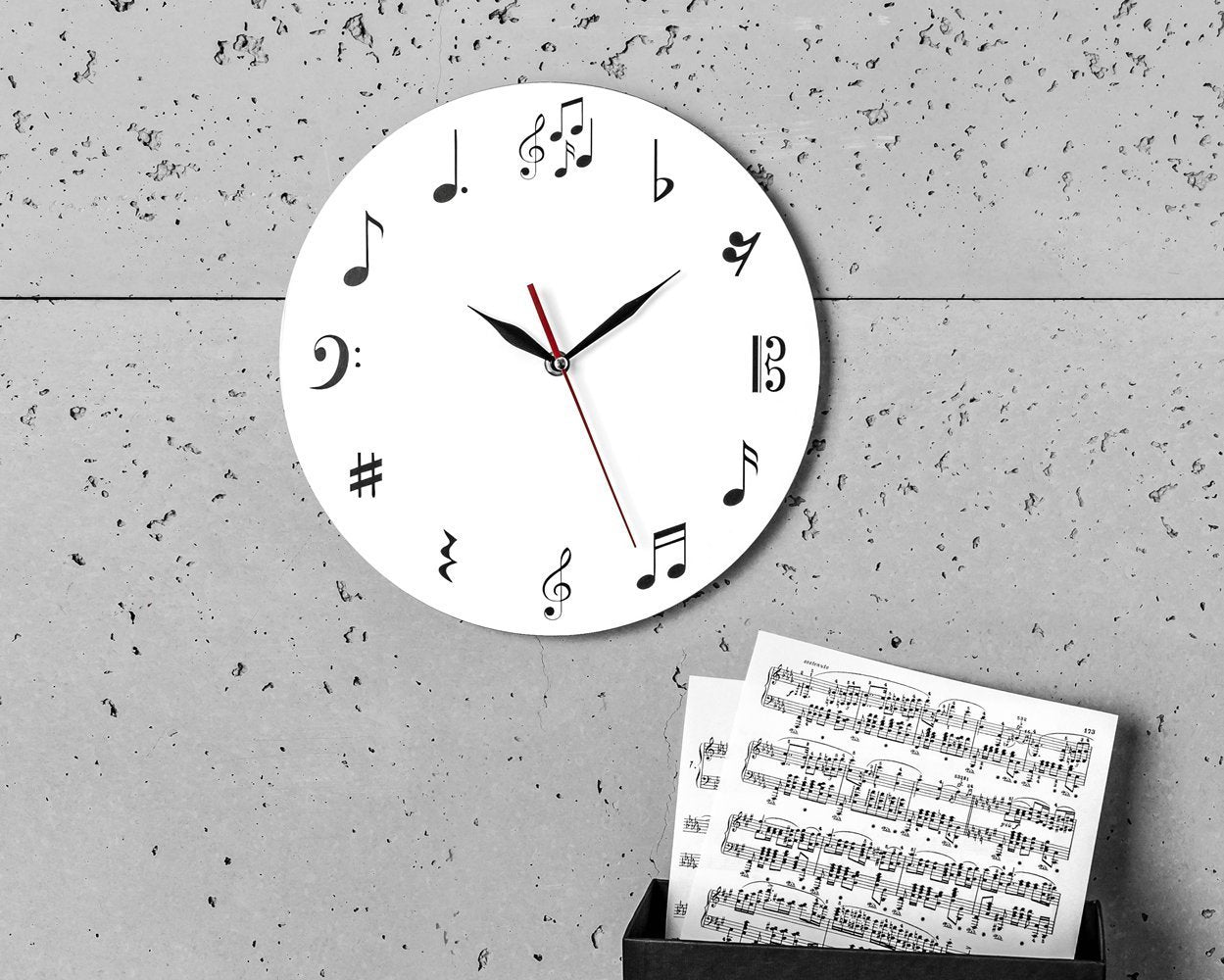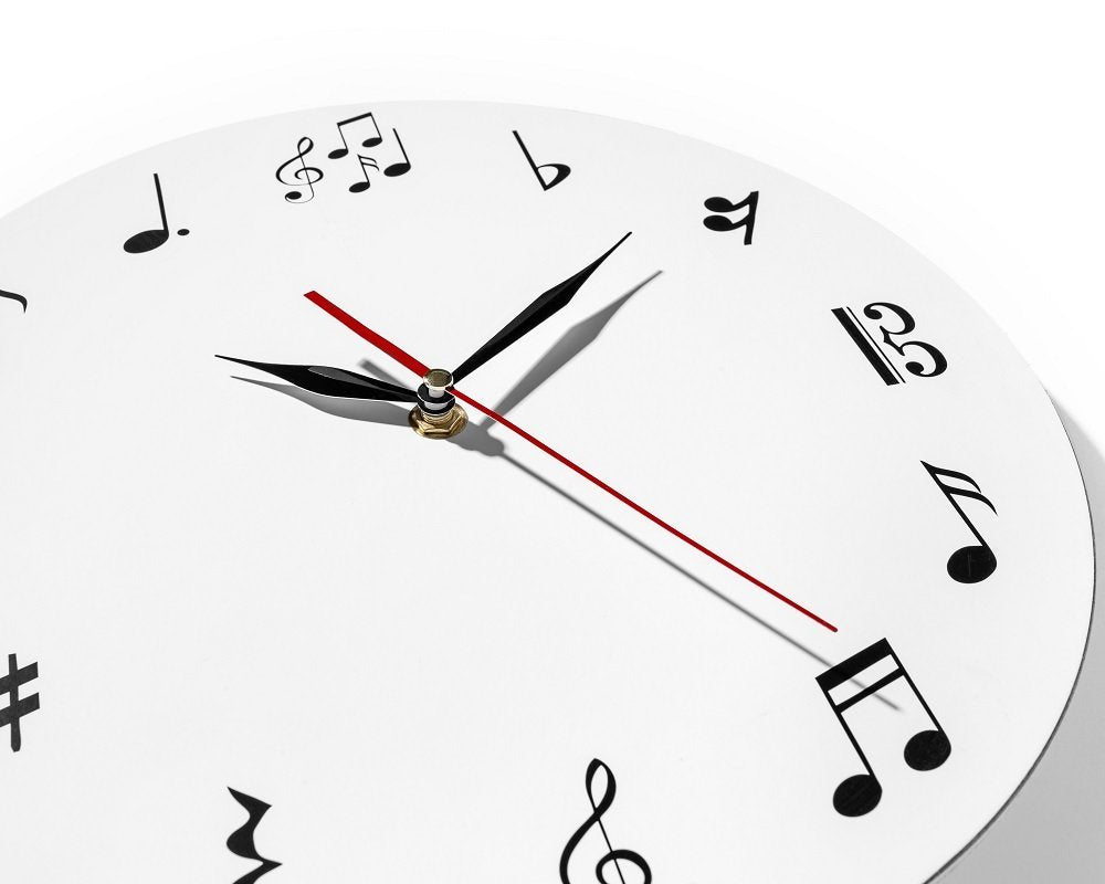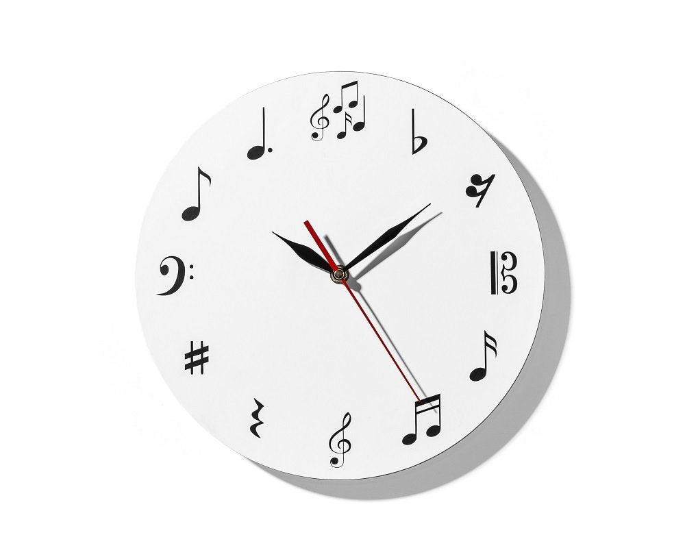 Stilīgs dekoratīvs sienas pulkstenis mūzikas stilā. Ar mūzikas notīm un simboliem parasto ciparu vietā. Funkcijas: - mūzikas pulkstenis ar notīm - kluss pulksteņa mehānisms - bez rāmja - ideāla dāvana visiem mūzikas mīļotājiem - materiāls: plastmasa - darbina 1 x AA baterija (nav iekļauta)