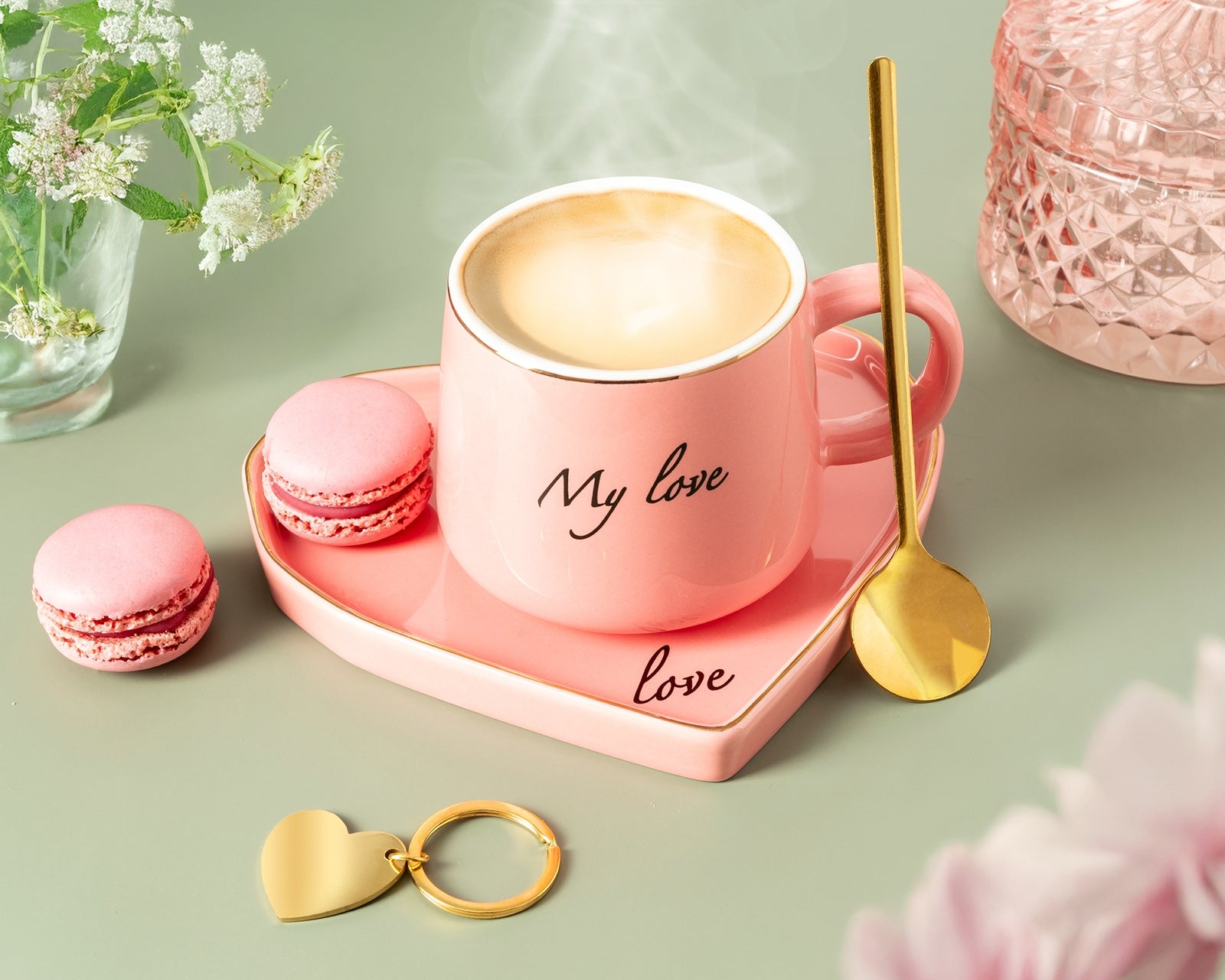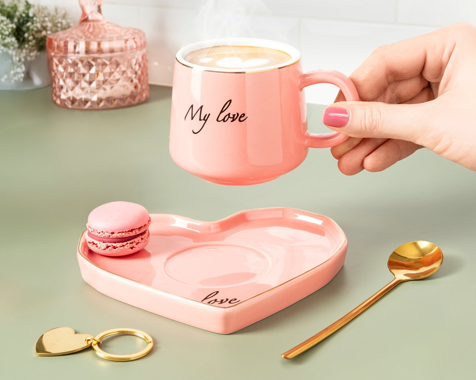 Izcili brīži ir pelnījuši tikpat izcilu noformējumu, un šis burvīgais dāvanu komplekts ir ideāls veids, kā pateikt kādam: "Tu man esi svarīgs." Komplekts sastāv no vairākiem elementiem, kas kopā rada elegances, smalkuma un dziļu emociju harmoniju – visu, ko vēlaties paust kādam sirdij tuvam cilvēkam. Šīs unikālās kolekcijas centrālais elements ir keramikas krūze romantiskā rozā tonī ar baltu iekšpusi, kas apdarināta ar zelta apmali un rotāta ar smalku, bet nozīmīgu uzrakstu: "Mana mīlestība". Tās forma lieliski ieguļ rokās, padarot katru mirkli ar iecienītāko dzērienu vēl īpašāku. Krūzei līdzi nāk skaisti izstrādāta sirds formas apakštasīte ar zelta apmali – mīlestības simbols –, kur krūze atrod savu vietu. Šis graciozais akcents piešķir komplektam raksturu. Komplektā ietilpst arī zelta karote, kas ne tikai uzsver dāvanas greznību, bet arī piešķir mirdzumu katram kafijas vai tējas mirklim. Tās smalkais spīdums kalpo kā atgādinājums atrast nedaudz maģijas ikdienas mirkļos. Komplektu papildina eleganta sirds formas atslēgu piekariņa, ko var piestiprināt pie atslēgām, somas vai mugursomas. Varat to iegravēt (ar gravētāju) ar personisku veltījumu vai sirsnīgu mīlestības apliecinājumu. Vienmēr un visur tas atgādinās saņēmējam par personu, kas viņam uzdāvināja šo mīlestības pilno dāvanu. Tas ir mazs, bet nozīmīgs žests, kas paliek atmiņā katru dienu. Šis komplekts ir vairāk nekā tikai priekšmeti – tas ir rūpju, siltuma un sirsnības izpausme. Lieliski piemērots jebkuram gadījumam, sākot no dzimšanas dienām līdz jubilejām, līdz pat Valentīndienai. Vai… vienkārši bez iemesla – tikai lai pateiktu “paldies, ka esi tu” vai izteiktu savas jūtas visstilīgākajā veidā! Uzdāviniet to kādam, kurš ir pelnījis nedaudz greznības un daudz mīlestības. Īpašības: elegants un sirsnīgs dāvanu komplekts sievietēm, kurā ietilpst keramikas krūzīte ar sirds formas paliktni, zelta karotīte un sirds formas atslēgu piekariņš ar gravēšanas iespēju (izgatavots no ārpakalpojumu gravētāja); krūzītes tilpums: 250 ml; krūzītes izmērs: 7 x 11 x 8 cm (diametrs); apakštasītes izmērs: 16 x 14 x 1,5 cm; karotes izmērs: 13,5 x 3 cm; atslēgu piekariņa izmērs: 6 x 3 cm; ilgstošai lietošanai: mazgāt tikai ar rokām un nelietot mikroviļņu krāsnī; stilīgs rozā dāvanu iepakojums.