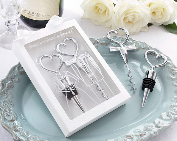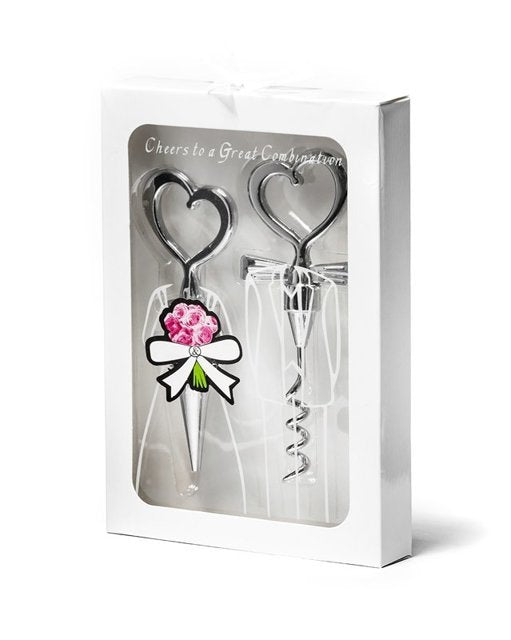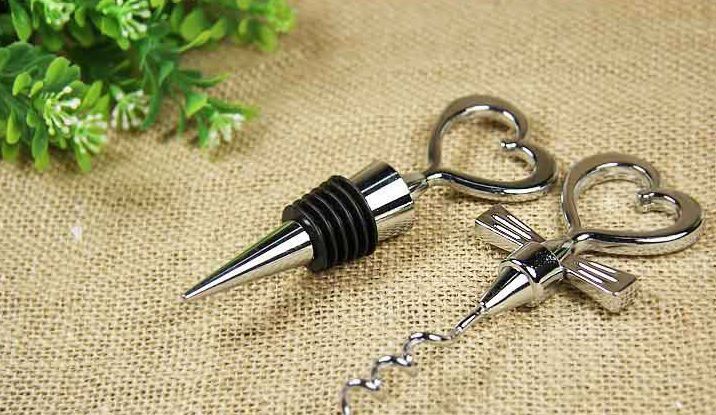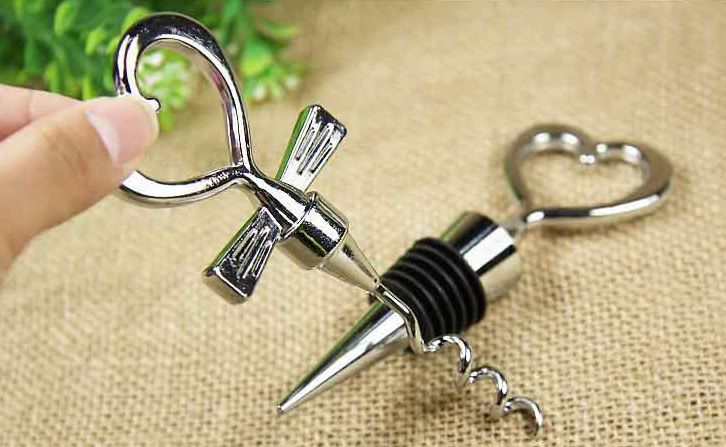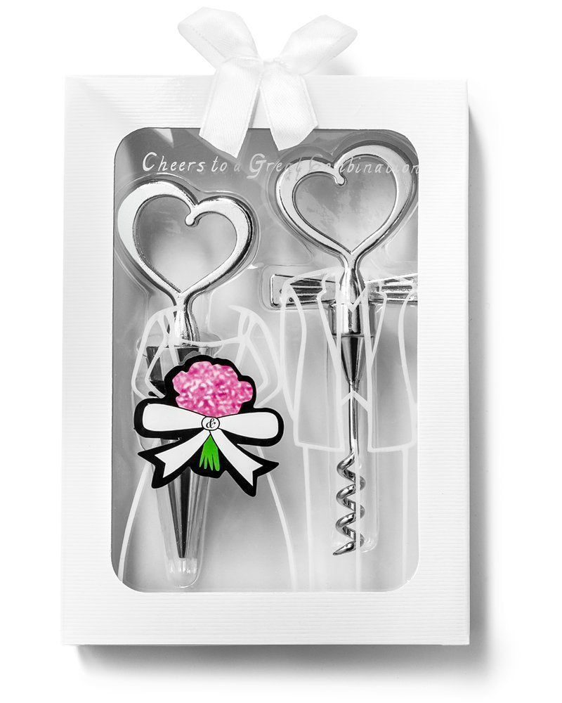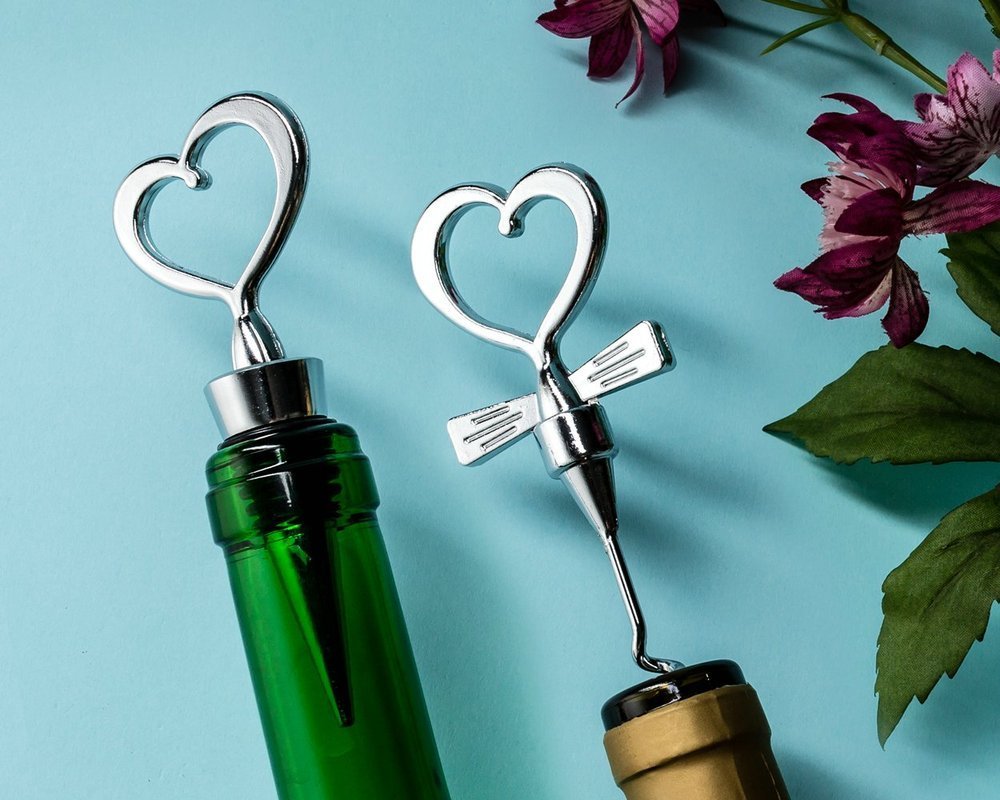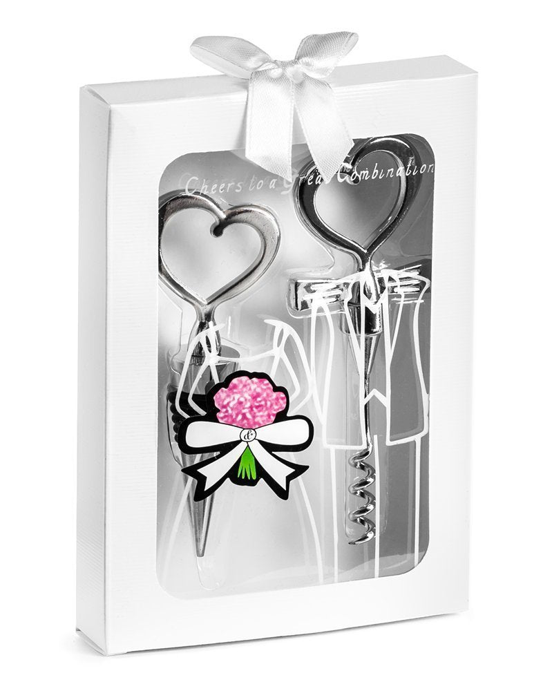 Pudeles aizbāznis ar sirds formas augšdaļu un korķviļķis ar sirds formas augšdaļu un "smokinga kaklasaite" ir lieliska kombinācija. Šis dīvainais vīna komplekts ir unikāls un sirsnīgs veids, kā jūsu viesi atcerēties jūsu īpašo dienu. Cietais hroma pudeles aizbāznis un korķviļķis ir dāvanu kastītē ar samtam līdzīgu interjeru un caurspīdīgu vāku ar rotaļīgu līgavas un līgavaiņa dizainu. Funkcijas: - sirds formas dāvanu komplekts - jauks dāvanu iesaiņojums - balta iepakojuma versija (pieejama arī melnā krāsā)