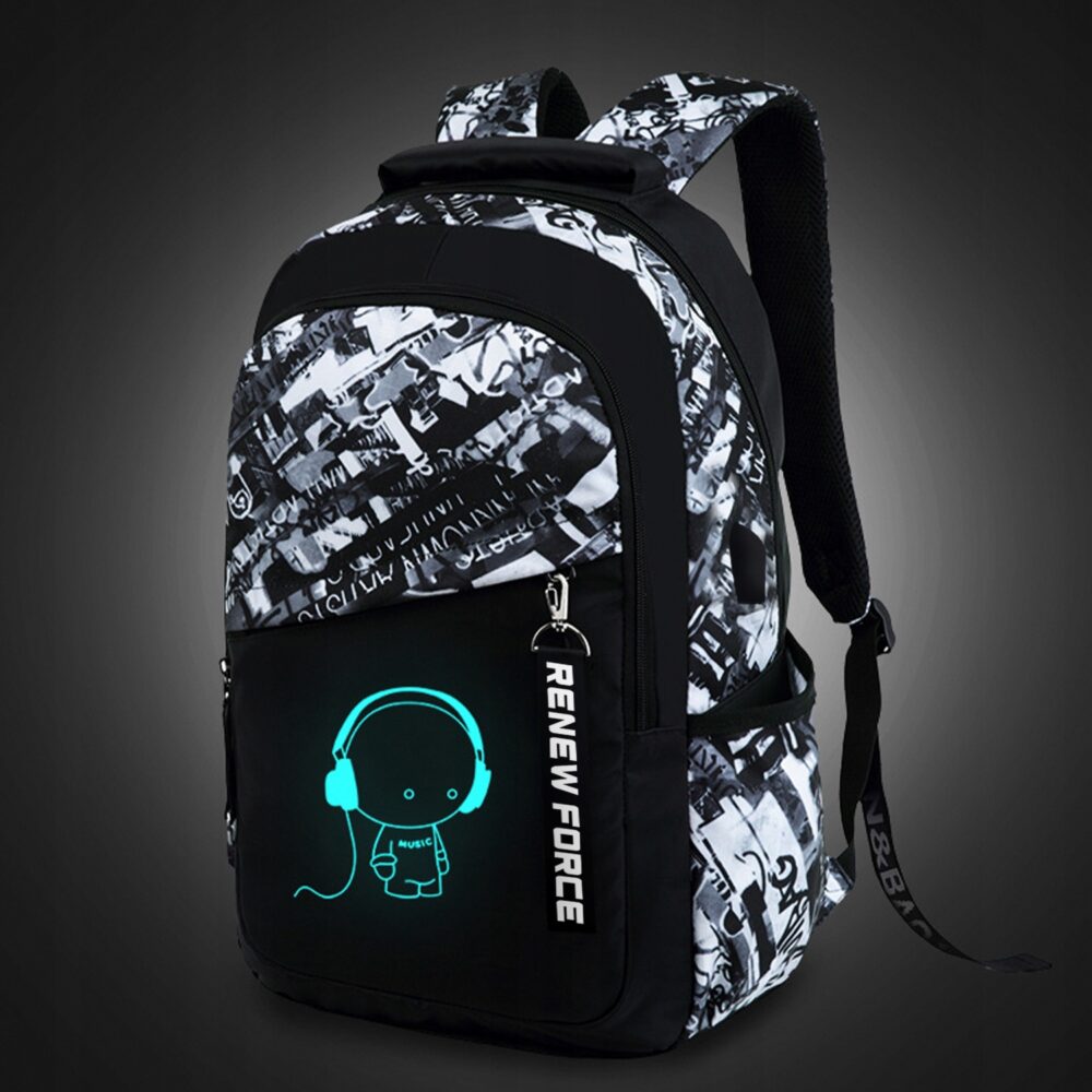 mugursomai ir daži ērti piederumi, tostarp USB kabelis, AUX ligzdas kabelis un