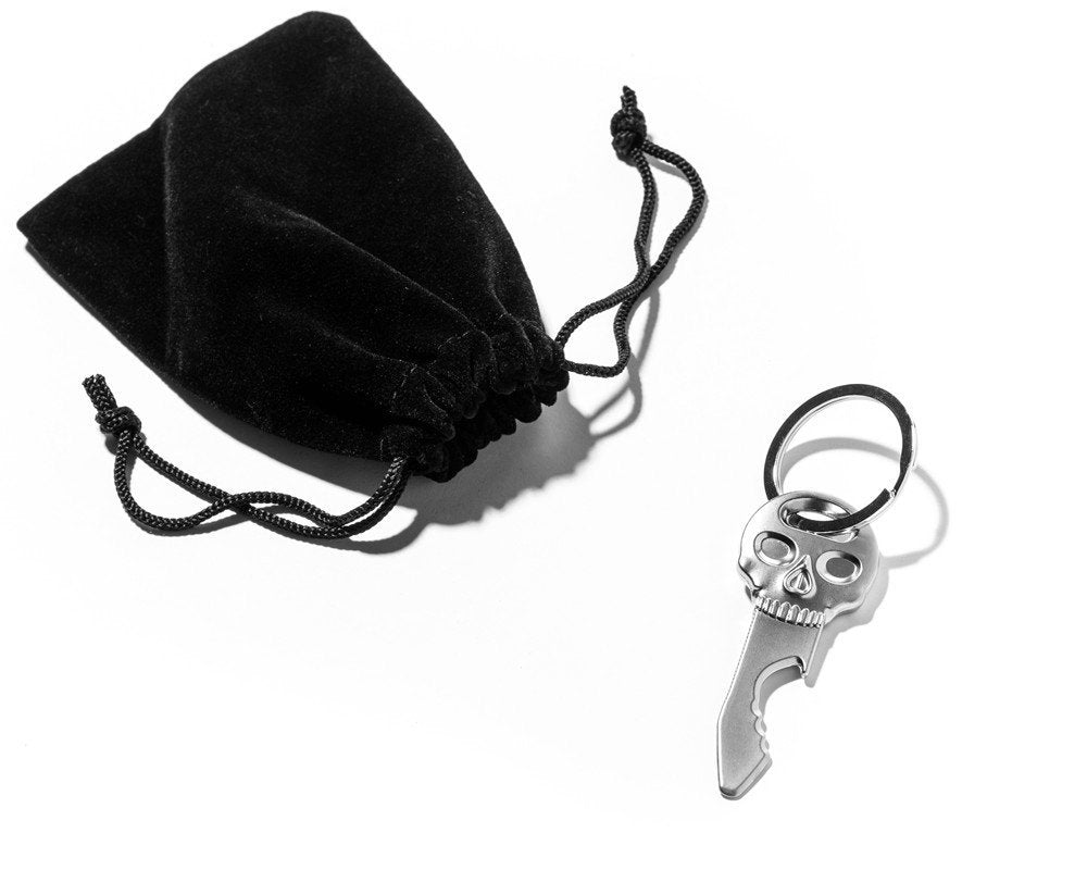 Jauks metāla galvaskausa formas pudeļu attaisāmais ar metāla gredzenu. Funkcijas: - galvaskausa metāla pudeļu attaisāmais - ar metāla gredzenu piestiprināšanai pie biksēm vai somas pakas - atslēgas var piestiprināt pie metāla riņķa - plakano galu var izmantot ārkārtas situācijās kā skrūvgriezi - iepakota ib melna samta soma