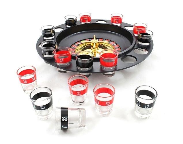 ietilpst ruletes rats, 2 metāla bumbiņas un 16 stikla glāzes.