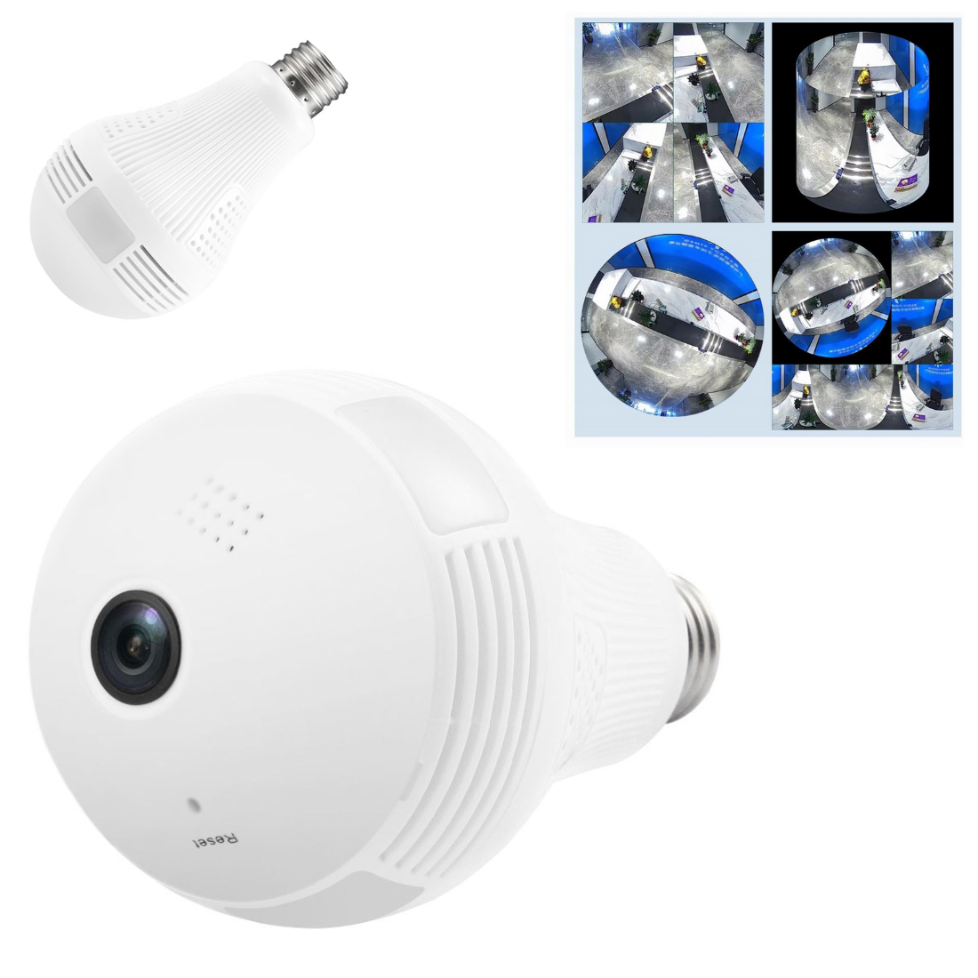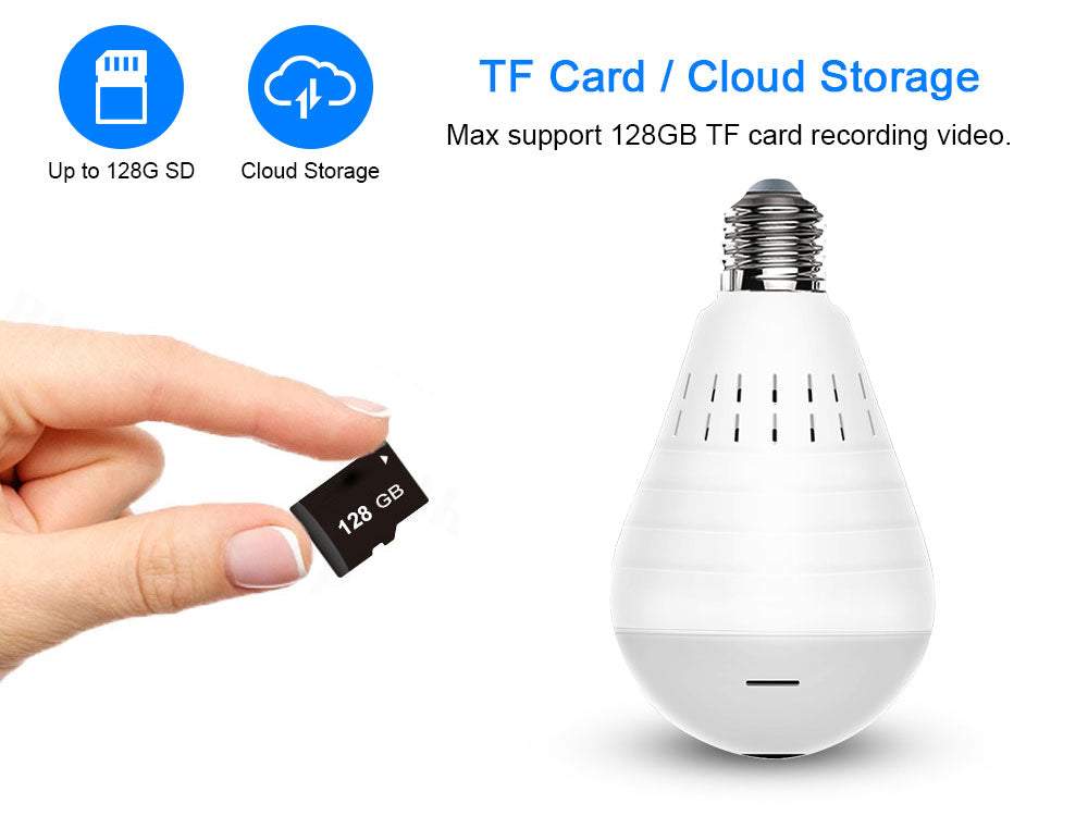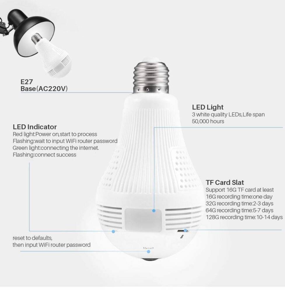 HD mini WiFi kamera iebūvētā LED spuldzē. Tā ir gan kamera, gan parasta spuldze ar LED diodēm. Spuldzes-kameras redzes lauks ir līdzīgs, kā 5 standarta kamerām! Ierīcei nav nepieciešams papildu barošanas avots.