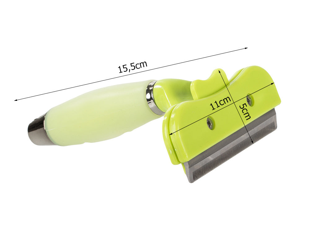 Mājdzīvnieku trimmeris suņiem, kaķiem, zirgu spalvām no nerūsējošā tērauda. Mājdzīvnieku trimmeris ir sensacionāla un vienkārša ierīce, ar kuru var ātri atbrīvoties no pavilnas un izkritušiem matiem suņiem, kaķiem vai zirgiem. Tas palīdz uzturēt veselīgu un spīdīgu kažoku un pat samazina apmatojuma izkrišanu par 90%. Tas ir efektīvāks par birstēm vai ķemmēm ķemmēšanai. Trimmera zobi ir izgatavoti no izturīga nerūsējošā tērauda. Rokturis ir pārklāts ar gumijas materiālu, tāpēc tas neizslīdēs no rokas. Aprīkots ar ātrās tīrīšanas pogu — vienkārši nospiediet to, un jūs varat noņemt matiņus, neizrokot tos no birstes. Mājdzīvnieku trimmerim ir arī balts aizsargvāciņš. tehniskās specifikācijas: - ļauj ātri un viegli atbrīvoties no pavilnas un izkritušā apmatojuma - palīdz uzturēt veselīgu un spīdīgu apmatojumu - samazina apmatojuma izkrišanu par 90% - ir - likvidē atmirušo pavilnu, necirpjot apmatojumu - asmens izgatavots no izturīga tērauda - ieteicams vidējiem un lieliem suņiem, kaķiem un zirgiem - izmēri: 15,5 cm x 11 cm x 5 cm - gumijas rokturis - ieteicams audzētāju - pašattīrīšanās mehānisms - krāsa: zaļa Komplektā ietilpst: - mājdzīvnieku trimmeris