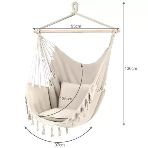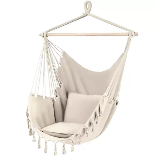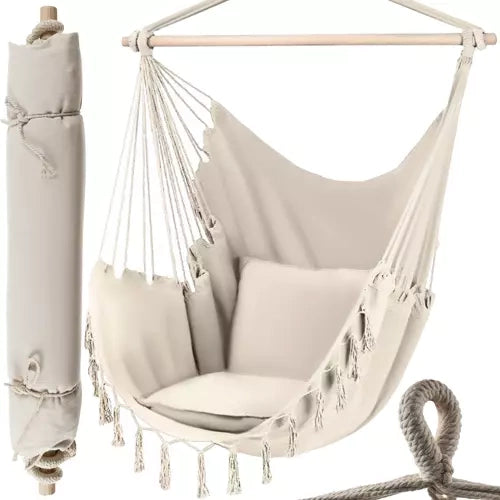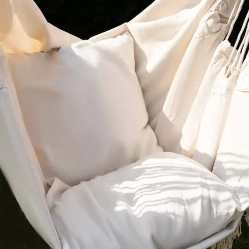 Šūpuļtīkla piekaramais krēsls bēšā krāsā, Brazīlijas krēsls + 2 ērti spilveni - šis ārkārtīgi ērtais un funkcionālais šūpuļtīkls - Brazīlijas krēsls ļaus jums atpūsties ērtos apstākļos. Lieliski piemērots dārzam, terasei vai balkonam! Varat to izmantot siestas laikā pēc vakariņām, īsai snaudai vai atpūšoties ar grāmatu vai žurnālu. Izturīgs materiāls - 65% kokvilna nodrošina atbilstošu ventilāciju, kas palielina piekaramā krēsla lietošanas komfortu pat karstās dienās. 35% poliestera piejaukums ir atbildīgs par sēdekļa izturību. Ciets montāžas gredzens ir savienots ar izturīgām virvēm, kas vienmērīgi sadalītas šūpuļtīkla sānos caur koka šķērsstieni. Šis dizains atvieglo pakāršanu, un šūpuļtīkls ir labi līdzsvarots un stabils. Iekļauti 2 spilveni - lai nodrošinātu maksimālu komfortu atpūtas laikā, komplektā ietilpst divi ērti spilveni, kas nodrošinās mīkstu atbalstu atpūtas laikā. Koka šķērsstienis - pateicoties tam, ka šūpuļtīklam ir koka šķērsstienis, tas ļauj ieņemt ērtu stāju atpūtas laikā. Varat brīvi lasīt un vērot apkārtni. Tas būs lieliski piemērots, ja to pastāvīgi uzstādīs dārzā. Specifikācija - krāsa: bēša; Materiāls: 65% kokvilna + 35% poliestera koks; maksimālā slodze: 120 kg; spilvena izmēri: 40 x 40 cm; sēdekļa izmēri: 125 x 97 cm; izmēri: 130 x 97 cm; svars: 1,9 kg; iepakojuma svars: 2180 kg. Specifikācija: bēša krāsa; materiāls: 65% kokvilna + 35% poliestera koks; maksimālā slodze: 120 kg; spilvena izmēri: 40 x 40 cm; sēdekļa izmēri: 125 x 97 cm; izmēri: 130 x 97 cm; svars: 1,9 kg; iepakojuma svars: 2180 kg; iekļauts atpūtas krēsls; 2 x spilveni. Dārza, terases vai balkona lietošanas prieku var palielināt, izmantojot ērtas mēbeles un atpūtas aksesuārus. Piekarināms dārza krēsls ir īpaša veida atpūtas krēsls, kas darbojas pēc šūpuļtīkla principa. Tam ir ērts, mīksts sēdeklis un atzveltne, kas izgatavoti no dabīgas kokvilnas ar smalku poliestera piejaukumu. Tas padara to ne tikai patīkamu pieskārienam, bet arī izturīgu.