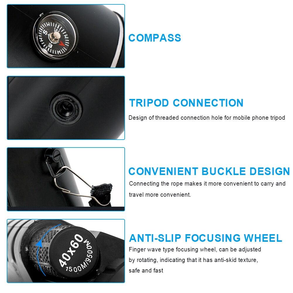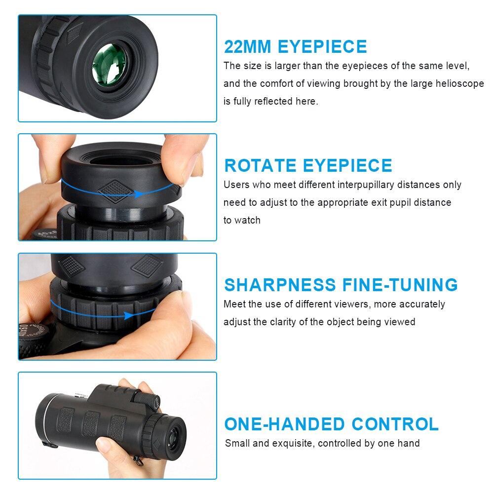 Monokulārs ir pārklāts ar FMC daudzslāņu platjoslas zaļo plēvi, lai nodrošinātu maksimāli augstu gaismas caurlaidību 99,5%. Fiksētais monokulāra palielinājums ir 40 reizes. Redzes lauks ir 1500 / 9500 m. Katrs monokulārs ir aprīkots ar 40 x 60 lieljaudas objektīvu un BAK4 prizmu, kas var nodrošināt vizuālo precizitāti un lielisku gaismas avotu, kas padara to ideāli piemērotu ceļojumiem, putnu vērošanai, pārgājieniem, savvaļas dzīvnieku vērošanai un citām aktivitātēm.