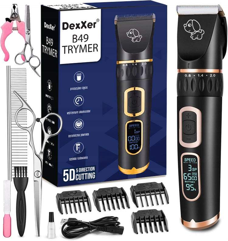 Praktisks dzīvnieku trimmeris suņiem un citiem mājdzīvniekiem ir ideāla ierīce, kas nodrošinās Jūsu mīluļa nevainojamu izskatu un komfortu! Tērauda asmeņi nodrošina perfekti precīzu griezumu. Griešanas garumu var regulēt manuāli, izmantojot grozāmo pogu. Garāku spalvu modelēšanā palīdz komplektā iekļautie uzgaļi. Lūdzu, ņemiet vērā, ka trimmeris ir piemērots mājdzīvnieku spalvām. To nevar izmantot lauksaimniecības dzīvnieku, piemēram, aitu, cirpšanai. Trimmerim ir ergonomisks dizains, un tas lieliski iederas rokā, pateicoties kam tas ļauj veikt ļoti precīzus griezumus. Ierīcei ir iebūvēts ietilpīgs akumulators, kas, pilnībā uzlādēts, nodrošina darba laiku līdz 240 minūtēm. Bezvada darbības iespēja ļaus aizsniegt pat grūti aizsniedzamas vietas. Izlādējies trimmeris griešanas laikā? Negaidiet, pievienojiet to kontaktligzdai un izmantojiet kā vadu ierīci! Kļūsti par labāko kopšanas speciālistu savam mājdzīvniekam! Trimmera asmeņi ir izgatavoti no titāna. Keramikas pārklājums nodrošina to izturību. Asmeņi neplēš spalvas, bet precīzi nogriež. Pateicoties tam, griešanas process neradīs dzīvniekam neertības. Daudziem mājdzīvniekiem nepatīk trimmeru skaņa. Konkrētā ierīce ir aprīkota ar jaunās paaudzes dzinēju, pateicoties kuram tā strādā ārkārtīgi klusi – ar trokšņu līmeni zem 50 dB. Asmens galva ir ūdensnecaurlaidīga un to var mazgāt zem ūdens, tomēr atcerieties to rūpīgi nosusināt pirms nākamās lietošanas reizes un esiet piesardzīgi, noņemot un uzliekot uzgali.