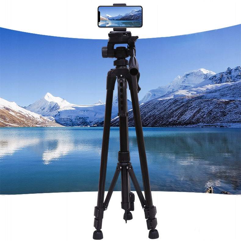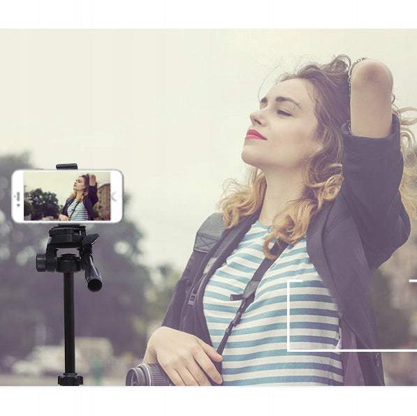 Īpaši viegls 103 cm statīvs ar tālvadības pulti un telefona turētāju ar neatkarīgi izbīdāmām teleskopiskām kājām, pateicoties kam pozīciju pielāgošana nelīdzenam reljefam ir vienkārša.