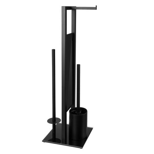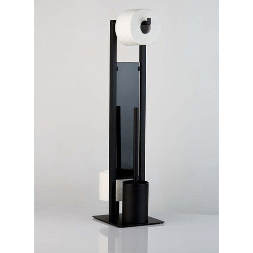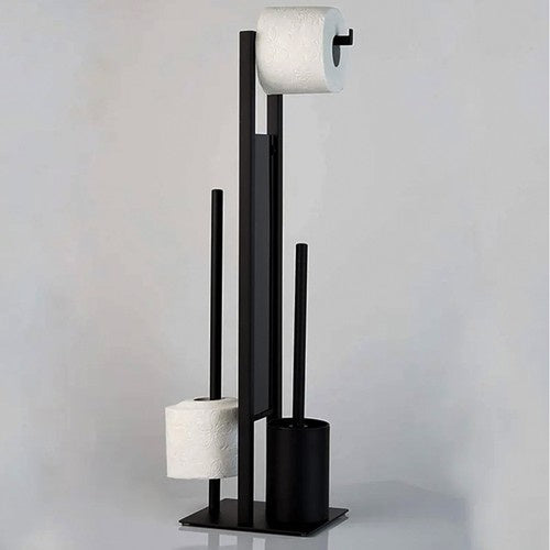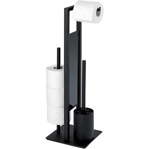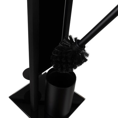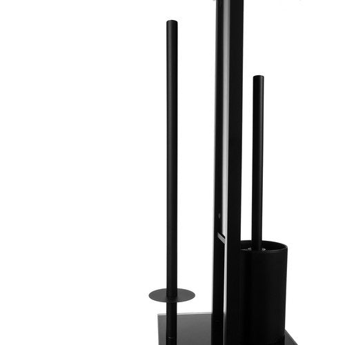 3in1 komplekts: tualetes papīra statīvs + tualetes birste + papīra turētājs. Elegants dizains un apdare - tualetes papīra statīvs ar birsti apvieno eleganci ar funkcionalitāti. Izgatavots no pulverkrāsota tērauda, tas izceļas ar modernu, matēti melnu apdari, kas lieliski iederas dažādos interjera stilos, sākot no moderna līdz klasiskam. Tas padara statīvu ne tikai lieliski izskatīgu, bet arī izturīgu pret koroziju un skrāpējumiem, kas garantē tā ilgmūžību. Tērauda statīva rāmis piešķir tam stabilitāti un vienlaikus modernu, minimālistisku izskatu. Statīva augšdaļa ir veidota, domājot par lietošanas ērtumu - ir pakaramais tualetes papīra rullim ar papildu aizsardzību, kas novērš papīra slīdēšanu. Šis risinājums padara papīra nomaiņu ātru un ērtu, un pats rullis vienmēr paliek savā vietā, pat intensīvas lietošanas gadījumā. Unikāli stikla elementi - statīva centrālais elements ir melna, spoguļota siena, kas izgatavota no stikla, kas ne tikai piešķir eleganci, bet arī pilda dekoratīvu funkciju. Stikla spoguļapdare piešķir produktam modernu raksturu, un spoguļa sienas matētā aizmugure harmonizējas ar citiem statīva matētajiem elementiem. Statīva pamatne ir izgatavota no melna spoguļstikla, kas ne tikai uzsver tā moderno dizainu, bet arī nodrošina visas konstrukcijas stabilitāti un izturību. Praktiskums un funkcionalitāte - statīvs ir izstrādāts, domājot par maksimālu funkcionalitāti. Statīva priekšpusē ir apaļa, melna, matēta tvertne, kas izgatavota no augstas kvalitātes PVC, kas kalpo kā birstes uzglabāšanas vieta tualetes tīrīšanai. Birstei ir rokturis, kas izgatavots no nerūsējošā tērauda ar pulverkrāsojumu, kas nodrošina tās izturību. Izturība un izturība pret koroziju. Birstes galviņa, kas izgatavota no PVC, ir viegli tīrāma un nodrošina efektīvu tualetes tīrīšanu, kas ir ārkārtīgi svarīgi higiēnas uzturēšanai vannas istabā. Turklāt statīva aizmugurē atrodas praktisks statīvs ar apaļu pamatni trim papildu tualetes papīra ruļļiem, kas ir ideāls risinājums cilvēkiem, kuri novērtē kārtību un ērtības. Stabilitāte un drošība - tualetes papīra statīvs ir izstrādāts, domājot par stabilitāti un lietošanas drošību. Statīva pamatne ir izgatavota no melna spoguļstikla, kas ne tikai piešķir tam eleganci, bet arī nodrošina stabilu atbalstu. Turklāt statīva apakšā ir četri pretslīdes paliktņi, kas aizsargā grīdu no skrāpējumiem un novērš statīva slīdēšanu, kas ir īpaši svarīgi mitros vannas istabas apstākļos. Specifikācija - krāsa: matēti melna; materiāls: nerūsējošais tērauds, stikls, PVC; pretslīdes kājiņas: jā; izmēri: 70 x 20 x 18,5 cm; svars: 2,1 kg; svars iepakojumā: 2,6 kg. Statīva specifikācija: krāsa: matēti melna; materiāls: nerūsējošais tērauds, stikls, PVC; pretslīdes kājiņas: jā; izmēri: 70 x 20 x 18,5 cm; svars: 2,1 kg; svars iepakojumā: 2,6 kg. Komplektā iekļauts: statīvs pašmontāžai. Brīdinājums: saturs: - ievērojiet montāžas instrukcijas; - izmantojiet preci tikai paredzētajam mērķim; - nelietojiet preci, ja tā ir bojāta.