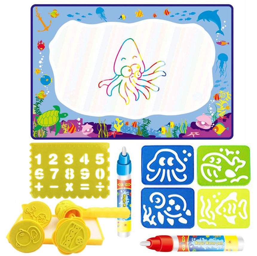 Paklājiņa izmēri ir līdz 75x50cm, līdz ar to tas var nodrošināt izklaidi pat vairākiem bērniem vienlaikus. Iekļautās pildspalvas ūdens uzpildīšanai, jautri zīmogi un rakstīšanas veidnes ļaus mazajiem izklaidēties stundām ilgi.