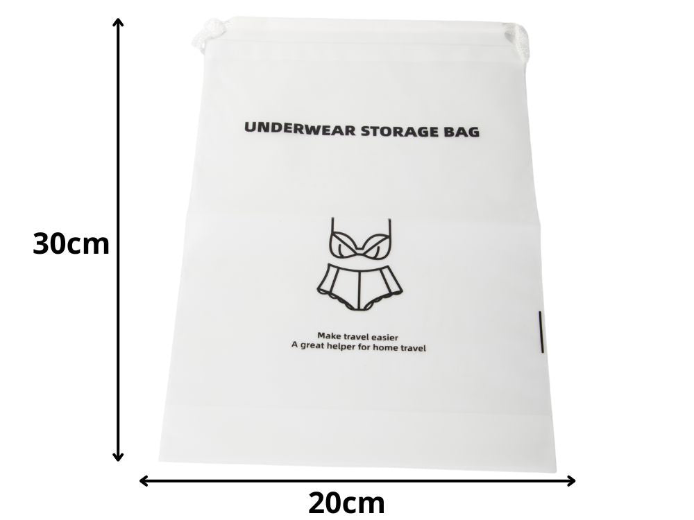 Ceļojuma soma apakšveļai lidmašīnā ūdensizturīgs organizators ceļojumu apakšveļai ceļojuma soma - ūdensizturīgs organizators jūsu čemodānam ceļojiet ērti un uzturiet savu čemodānu kārtībā! Ūdensizturīgā apakšveļas soma ir praktisks organizators, kas ļauj kārtīgi uzglabāt krūšturus, biksītes un citus apģērba gabalus. Aizsardzība pret mitrumu un netīrumiem, pateicoties ūdensizturīgajam materiālam, jūsu apakšveļa paliks sausa un tīra neatkarīgi no ceļojuma apstākļiem. Tā ir ideāli piemērota lidmašīnai, čemodānam vai sporta somai. Praktisks risinājums katram ceļojumam. Viegla un kompakta, šī soma neaizņem daudz vietas, un tās ietilpība ļauj ērti uzglabāt vairākus apakšveļas komplektus. Daudzfunkcionāla lietošana - tā noderēs ne tikai apakšveļas, bet arī zeķu, pidžamu vai citu nelielu apģērba gabalu glabāšanai. Tehniskās specifikācijas: - augstas kvalitātes apstrāde - materiāls: peva - aizverams ar aukliņām - viegls - elegants dizains - izmēri: - krāsa: daļēji caurspīdīga - komplektā ietilpst: - zeķu un apakšveļas soma