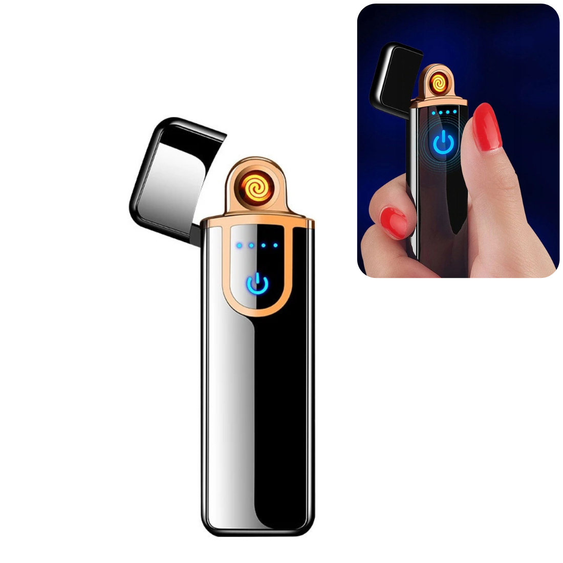 Šķiltavas, kuras nav nepieciešams uzpildīt ar gāzi. Vienkārši novietojiet pirkstu uz displeja sensora, lai iedarbinātu šķiltavas. Akumulatora uzlādes līmenis tiek atspoguļots LCD displejā.