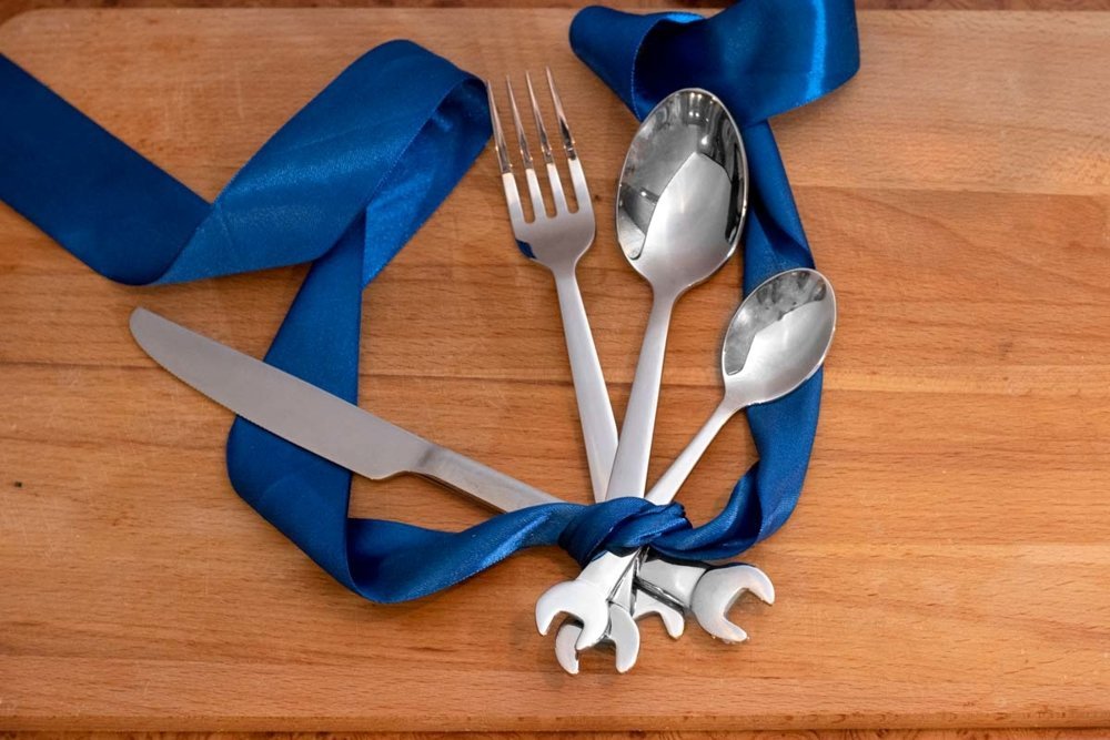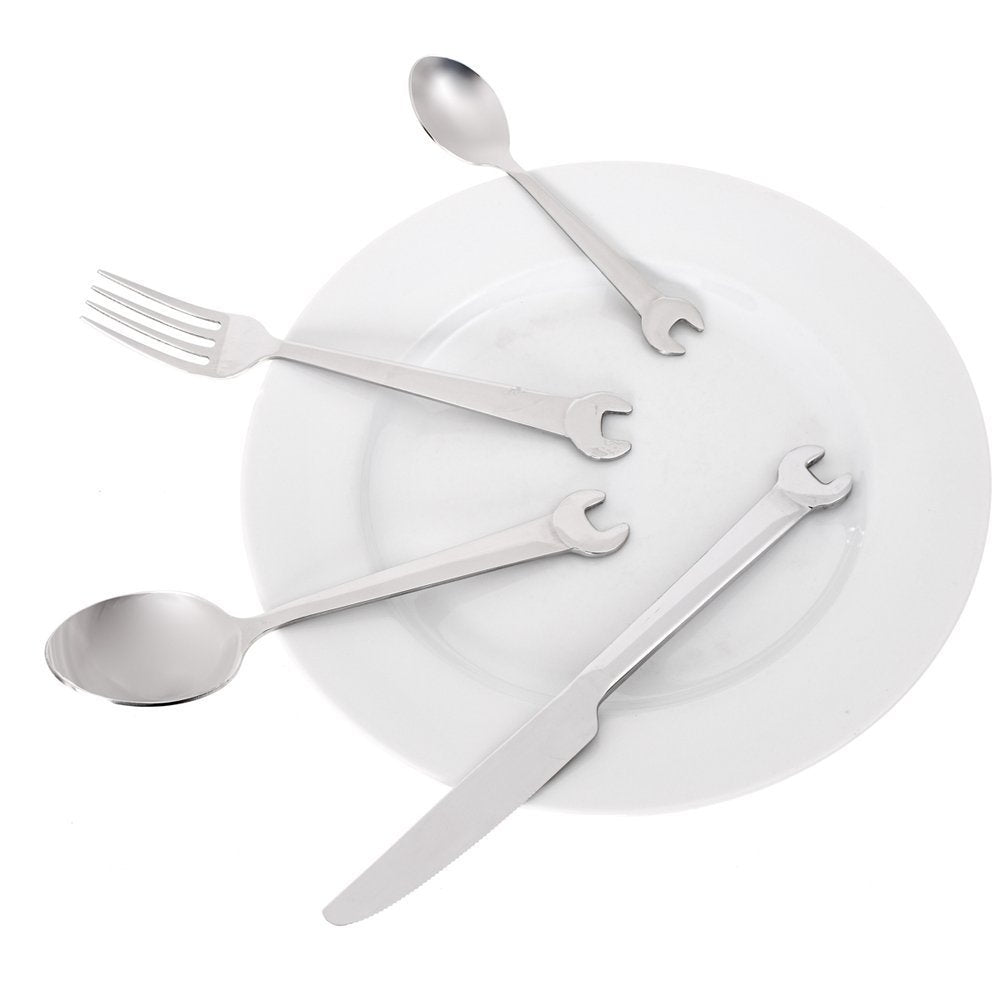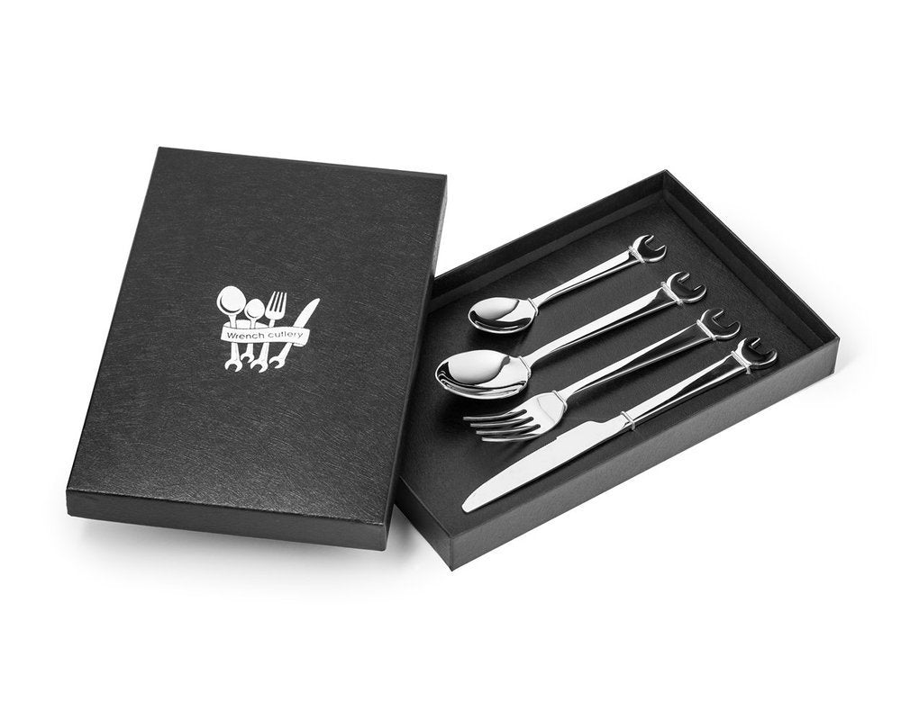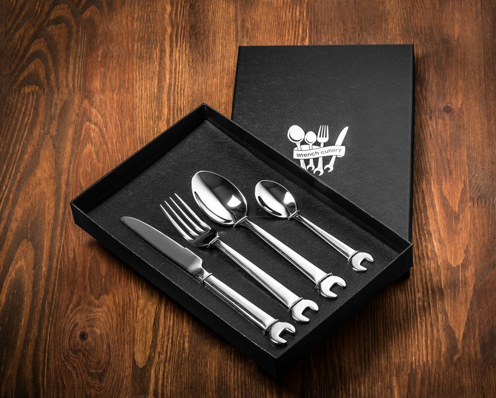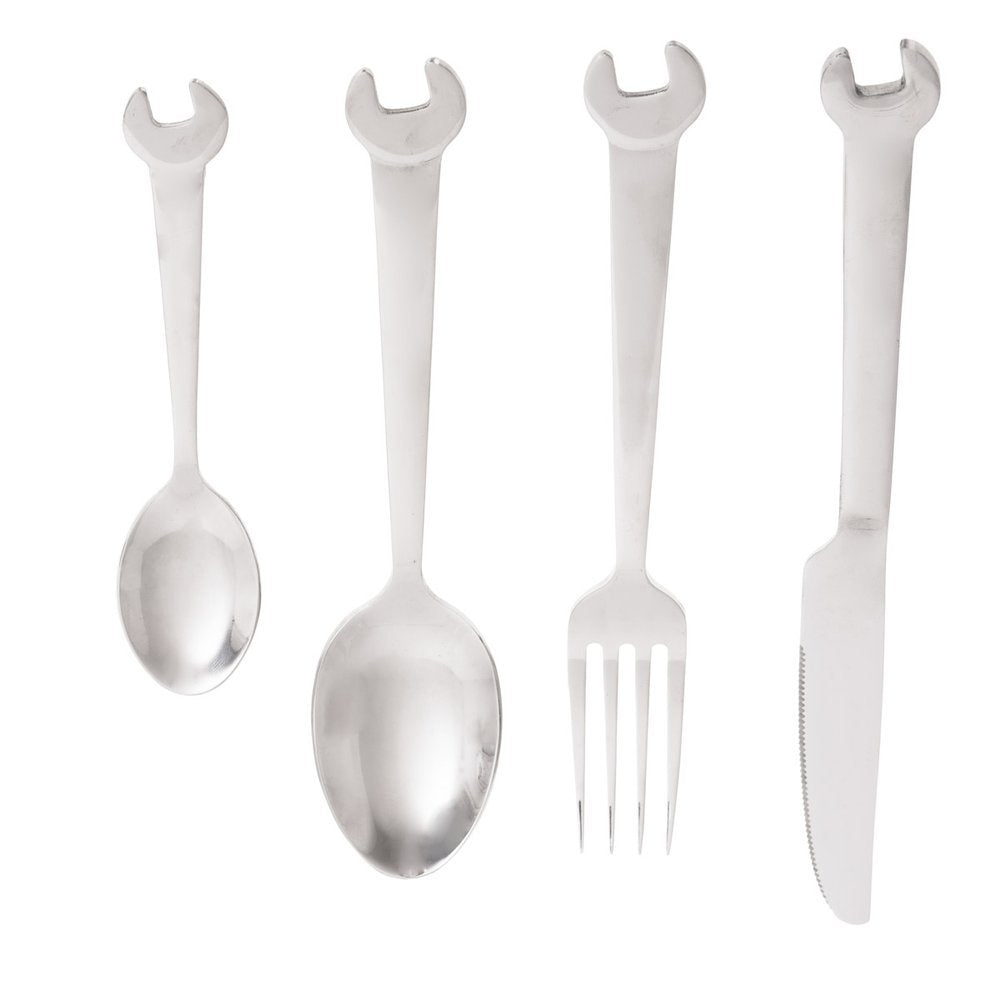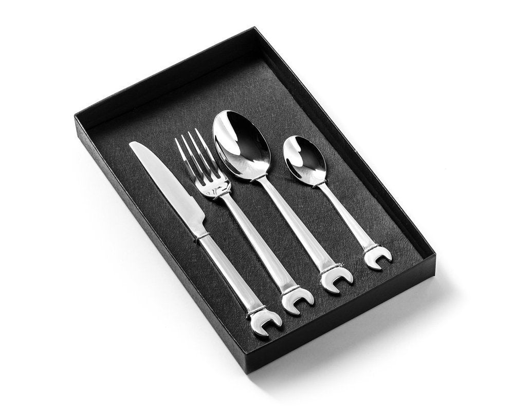 Ideāls uzgriežņu atslēgu galda piederumu komplekts ne tikai mehāniķiem vai meistariem, bet patiešām ikvienam vīrietim. Vēl vairāk tiem, kas kaut ko salabo vienreiz zilā mēness laikā :) Funkcijas: - uzgriežņu atslēgu galda piederumu komplekts 4gab - komplektā ietilpst: nazis, dakša, karote un tējas karote, viss ar atslēgas galvu - materiāls: nerūsējošais tērauds - izmērs: nazis 22, 5 x 2x0,3 cm; dakša 19x2,2x0,2 cm; karote 19x4x02, cm, tējas karote 14,4x3x0,2 - dāvanu iepakojums