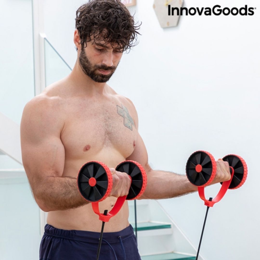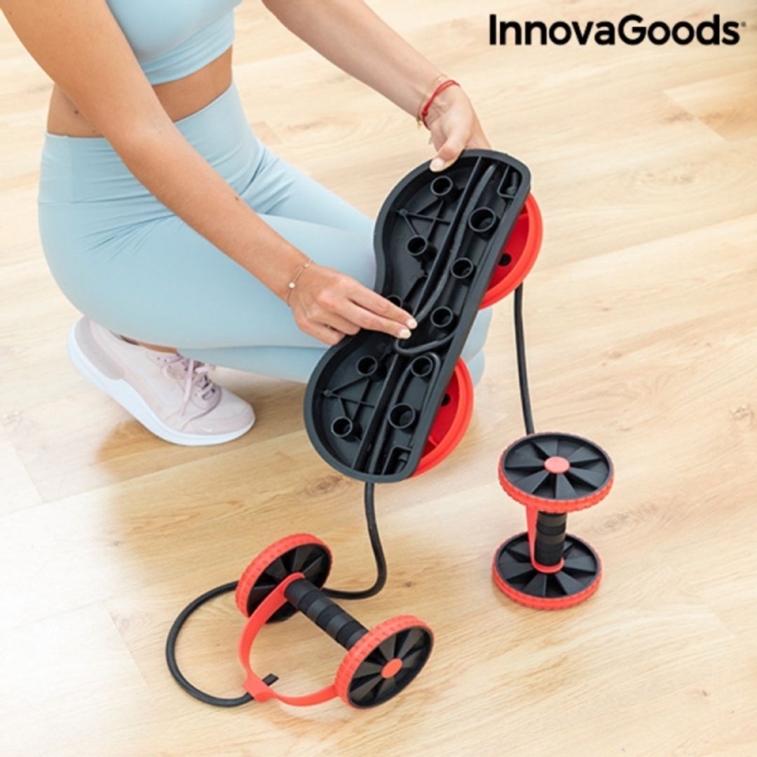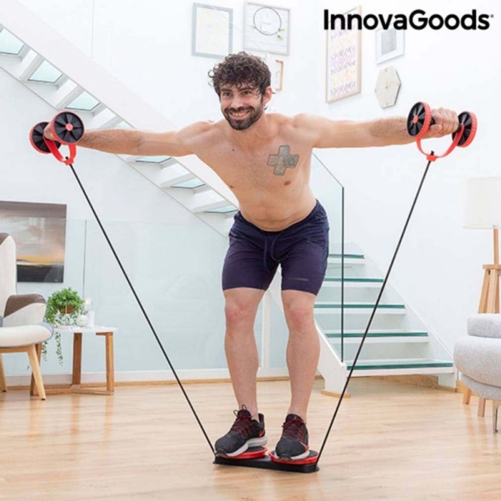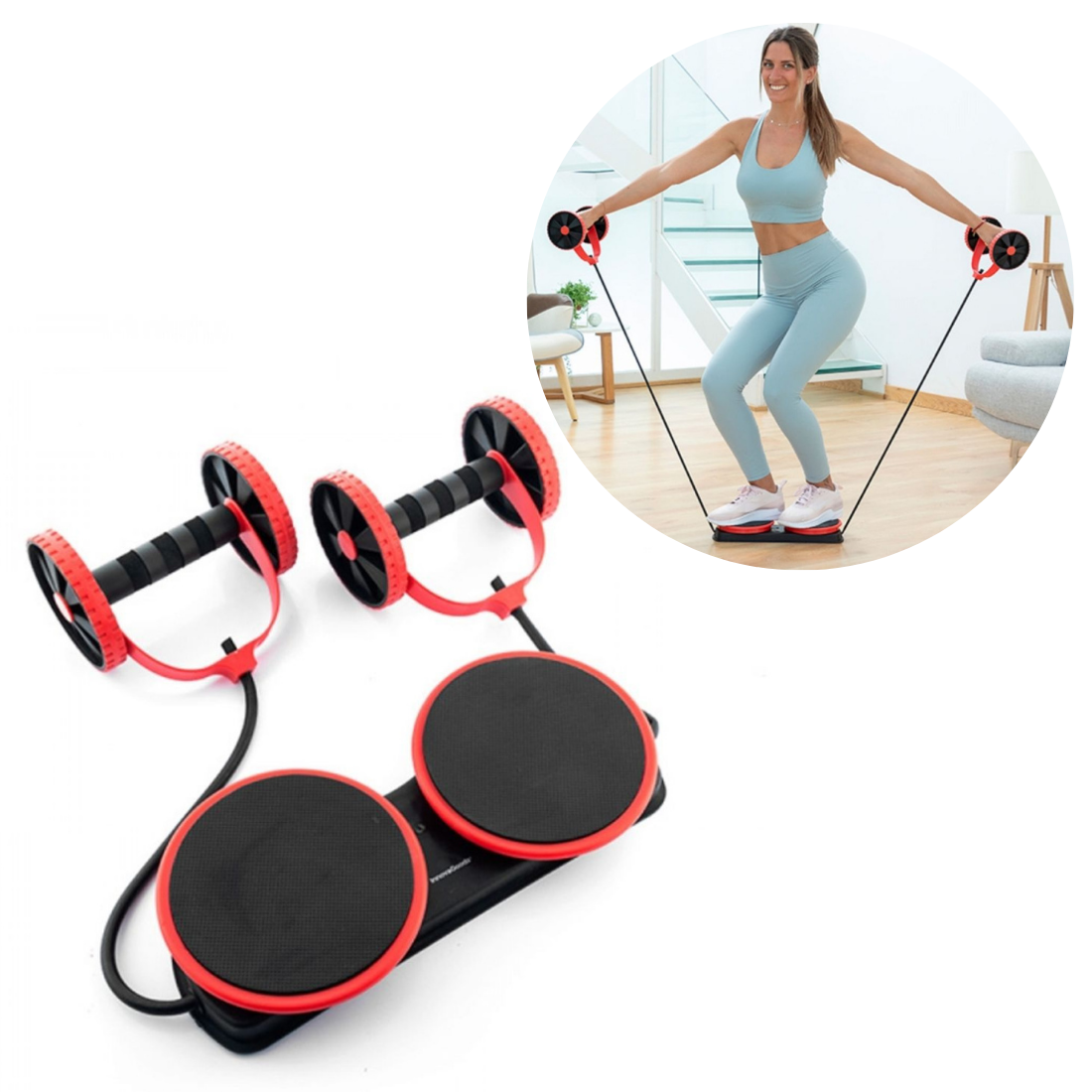 Divkāršs vēdera veltnis ar rotējošiem diskiem un elastīgām pretestības gumijām visaptverošam treniņam, kas ļauj veikt visdažādākos vingrinājumus pilnvērtīgam treniņam.