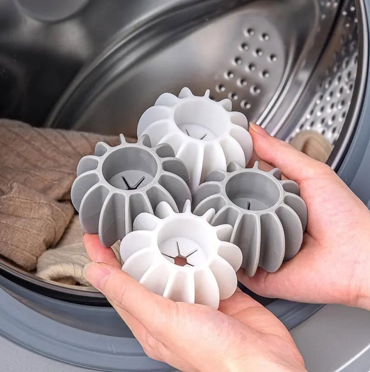 * Darbojas, lai mazgāšanas laikā no drēbēm noņemtu matus, kažokādas un citas