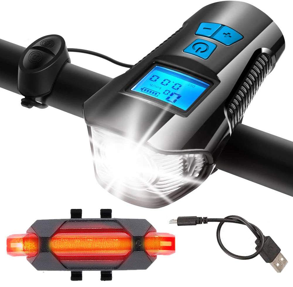 Priekšējais velosipēda lukturis ar spidometru + aizmugures gaismas lukturis