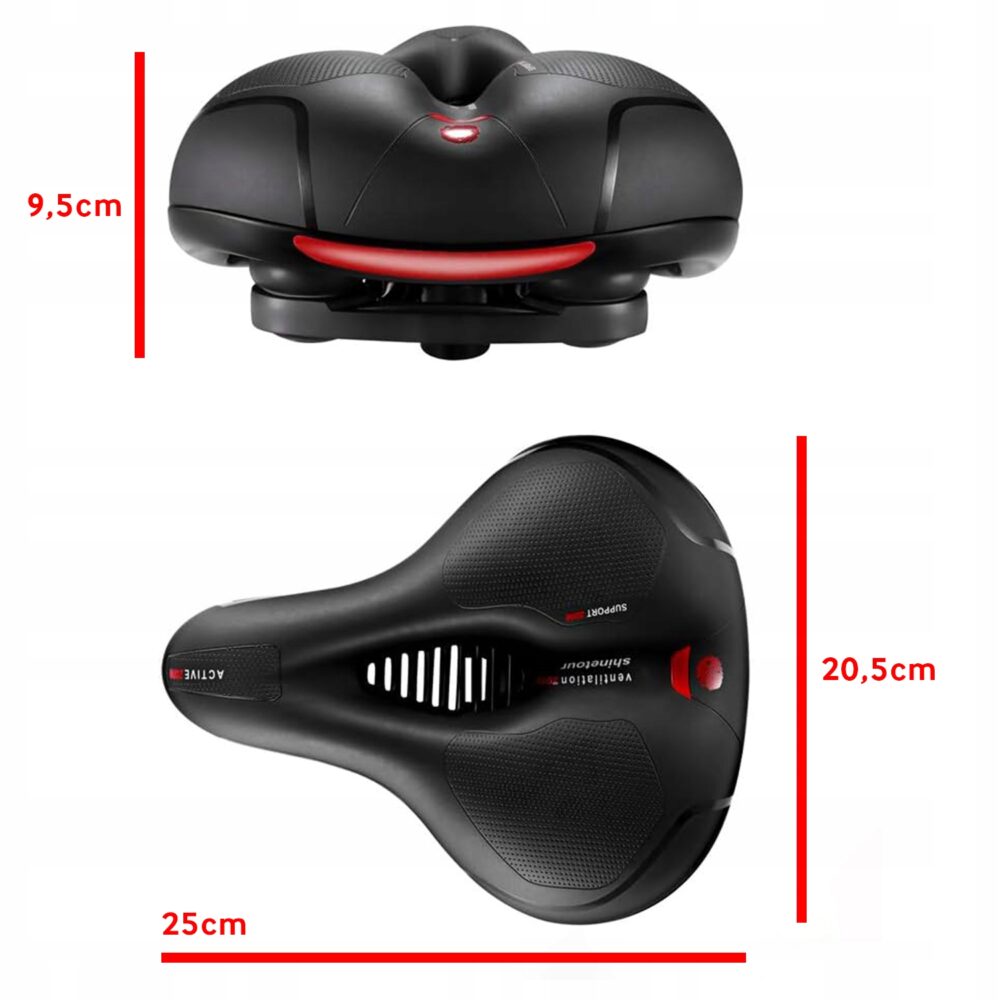 Šis sēdeklis ir izgatavots no izturīgas plastmasas, taču pildīts ar mīkstām putām. Tas ir tieši jums piemērotais izmērs — 25 cm x 20,5 cm x 9,5 cm. Tajā ir iekļauta atstarojoša josta, ko varat valkāt, kas ir īpaši noderīga, kad esat ārā pēc tumsas. Viena lieliska šī produkta īpašība ir tā, ka tas ir konstruēts ar ventilāciju. Tas nozīmē, ka jūs joprojām jutīsities ērti pat siltā laikā.