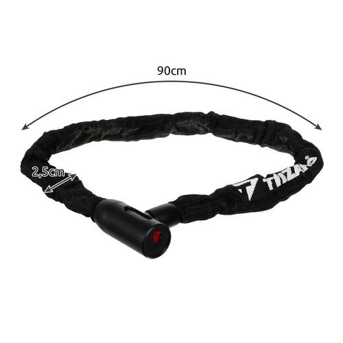 Velosipēda ķēdes slēdzenes drošība — velosipēda ķēde ar slēdzeni ir lielisks risinājums ikvienam, kurš vēlas nodrošināt savam velosipēdam visaugstāko drošības līmeni. Katram velosipēdu entuziastam jābūt velosipēda slēdzenei ar ķēdi. Šāds aksesuārs ir praktisks un noderīgs risinājums ikdienas lietošanai. Tas palīdz samazināt velosipēda zādzības risku. Ķēde — velosipēda slēdzene ar ķēdes krokām, 15 posmiem, 6 mm apaļš šķērsgriezums, kas palielina tās izturību pret griezumiem un triecieniem. Katrs posms ir rūpīgi izgatavots, lai atbilstu vissarežģītākajiem lietošanas apstākļiem. Velosipēda slēdzene ir izgatavota no 90 cm gara nerūsējošā tērauda, pārklāta ar ūdensnecaurlaidīgu tekstila apvalku. Slēdzama ar simetriskām atslēgām — slēdzene ir aprīkota ar atslēgas cauruma aizbāzni, kas aizsargā mehānismu no putekļiem un mitruma, kas nodrošina tā ilgstošu un bezatteices darbību. Turklāt slēdzene ir pārklāta ar drošu plastmasas pārklājumu, kas aizsargā rāmi no skrāpējumiem un nepieciešamības gadījumā amortizē nejaušus triecienus. Simetriskās atslēgas ir viegli lietojamas pat tumsā! Simetrija ļauj slēdzeni atvērt jebkurā pozīcijā. Universāla — šī ķēde ar slēdzeni ir ideāli piemērota velosipēdu nostiprināšanai gan īsu apstāšanās, gan ilgāku pārtraukumu laikā. To var izmantot, lai nostiprinātu velosipēdu veikala, skolas, darba vai parka priekšā. Tā ir arī lieliska izvēle velobraucieniem, kur bieži atstājat velosipēdu apstāšanās vietā nezināmā apvidū. Turklāt to var izmantot arī cita sporta aprīkojuma, motociklu un pat ratiņu nostiprināšanai. Specifikācija - krāsa: melna; materiāls: nerūsējošais tērauds, neausts audums, PP; tips: ķēde; aizdares veids: slēdzene; apaļa posma diametrs: 6 mm; garums: 90 cm; ķēdes biezums: 2,5 cm; svars: 0,54 kg; svars iepakojumā: 0,548 kg. Drošības specifikācija: krāsa: melna; materiāls: nerūsējošais tērauds, neausts audums, PP; tips: ķēde; stiprinājuma veids: rāvējslēdzējs; apaļa posma diametrs: 6 mm; garums: 90 cm; ķēdes biezums: 2,5 cm; svars: 0,54 kg; svars iepakojumā: 0,548 kg. Komplektā iekļauts: ķēde, 2 x atslēgas. Velosipēda ķēde ar slēdzeni ir neaizstājams aprīkojums ikvienam velosipēdistam. Tās izturība, funkcionalitāte un estētika padara to par perfektu aizsardzību jūsu velosipēdam. Pateicoties augstākās kvalitātes materiālu izmantošanai un pārdomātam dizainam, šī ķēde garantē drošību un ilgstošu lietošanu. Neatkarīgi no tā, kur un kad to lietojat, varat būt pārliecināti, ka jūsu velosipēds ir labi aizsargāts. Brīdinājuma saturs: - pirms katras lietošanas reizes pārbaudiet, vai ķēdes posmi un slēdzenes mehānisms ir labā stāvoklī un bez nodiluma, plaisām vai korozijas. - pārliecinieties, vai ķēde nosedz gan velosipēda rāmi, gan fiksētu, cietu priekšmetu (piemēram, stieni vai velosipēdu bagāžnieku). - neatstājiet velosipēdu tumšās, izolētās vietās. - izmantojiet atslēgas cauruma aizbāzni, lai aizsargātu slēdzenes mehānismu no putekļiem, smiltīm un mitruma. Netīrumi var izraisīt slēdzenes iesprūšanu, samazinot tās efektivitāti. - pagrieziet atslēgu uzmanīgi, bez pārmērīga spiediena, lai nesabojātu mehānismu. - kad ķēde netiek lietota, uzglabājiet to sausā vietā, prom no tiešas ūdens vai mitruma iedarbības. - nenovietojiet ķēdi un slēdzeni tieši uz zemes, jo tas var veicināt netīrumu uzkrāšanos.