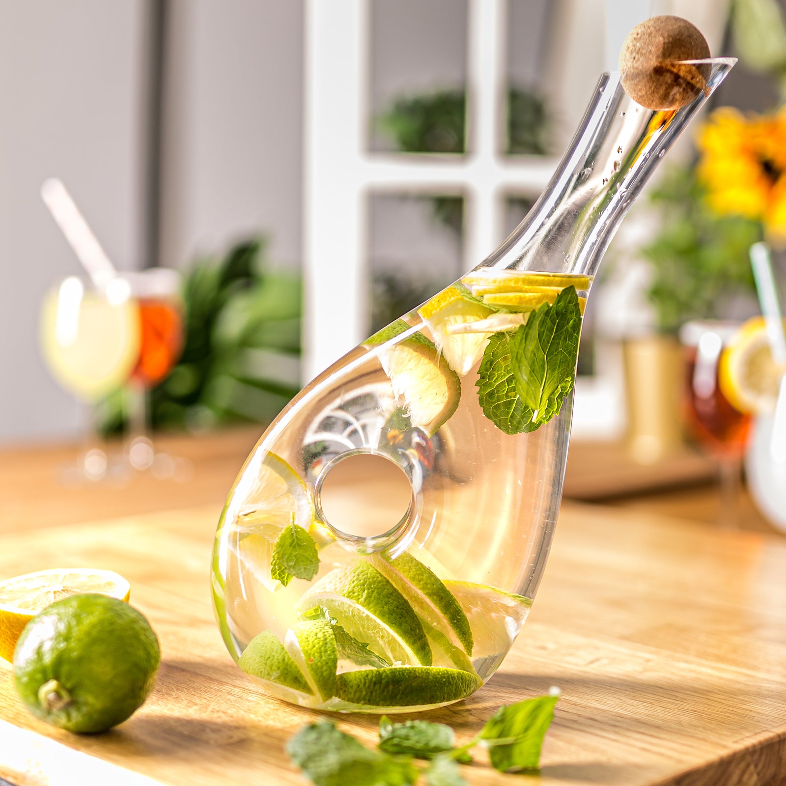 Mūsu vīna un ūdens karafes nedaudz savīta forma padara to skaistu & amp; unikāla. Ja izmanto sarkanvīnam (lejiet vīnu pie sienas), tas var kalpot kā aerators, padara garšu bagātīgāku, noslēdzas gludāku, pat vīna krāsa kļūst intensīvāka. Mūsu karafe var pasniegt ūdeni (piem., ar piparmētru vai limonu elegantā veidā, kā arī ne tikai jebkuros svētkos, bet arī katru dienu. Elegances pieskāriens uz jūsu galda. Funkcijas: - unikāla vīna un ūdens karafe un zona - ieskaitot apaļo dabīgā korķa aizbāzni - ja izmanto sarkanvīnam, tas piešķir vīnam bagātīgu garšu un gludu noskaņu - var izmantot arī eleganti pasniegtam ūdenim ekoloģiskā veidā - unikāls un moderns izskats - ar rokām pūsts bezsvina kristāla stikls - touch; elegance uz jūsu galda - eleganta savīta gliemeža forma un doba apļa dizains - īsta ietilpība 1200 ml - mazgāšana tikai ar rokām, lai padarītu lietošanu ilgstošu - eleganta dāvanu kaste;