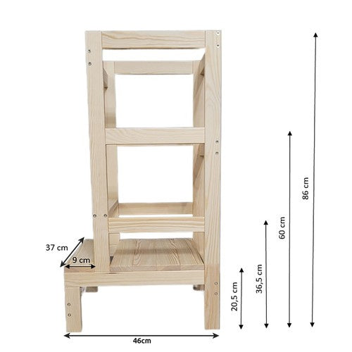 Virtuves palīga koka platforma bērniem drošam darbam un spēlēm virtuvē – virtuves palīgs bērniem ir praktisks un izglītojošs rīks, kas var ievērojami bagātināt bērnu kulinārijas pieredzi, vienlaikus nodrošinot viņu drošību un komfortu, kopīgi strādājot virtuvē. Regulējamas platformas – platformas, uz kuras stāv bērns, augstumu var regulēt, pielāgojot to bērna augumam un virtuves letes augstumam. Izstrādāts, domājot par jaunākajiem bērniem – "virtuves kāpšļa palīgs", īpašs rīks, kas izstrādāts, domājot par jaunākajiem bērniem. Tas ļauj bērniem droši un ērti piedalīties virtuves aktivitātēs un attīstīt kulinārijas prasmes. Stabila konstrukcija – palīgs ir stabili izgatavots no 1. klases priedes koka, kas nodrošina tā stabilitāti. Turklāt tam ir aizsargsliedes, kas neļauj bērnam nejauši izkrist, un visas malas ir perfekti pulētas. Specifikācija – materiāls: 1. klases priedes koks + metāls; krāsa: dabīga priede; ieteicamais minimālais lietotāja vecums: no 2 gadiem; ieteicamais maksimālais lietotāja svars: līdz 50 kg; regulējams platformas augstums: 20,5 cm, 36,5 cm, 60 cm; Ārējie izmēri: 46 x 37 x 86 cm; svars: 7,5 kg; svars iepakojumā: 8 kg. Palīga specifikācija: Materiāls: 1. klases priedes koks + metāls Krāsa: dabīga priede Ieteicamais minimālais lietotāja vecums: no 2 gadiem Ieteicamais maksimālais lietotāja svars: līdz 50 kg Regulējams platformas augstums: 20,5 cm, 36,5 cm, 60 cm Ārējie izmēri: 46 x 37 x 86 cm Svars: 7,5 kg Svars iepakojumā: 8 kg Komplektā iekļauts: Pašmontāžas palīgs Montāžas komplekts Instrukcija Pateicoties palīgam, bērns var piedalīties dažādās virtuves aktivitātēs, piemēram, jaukšanā, griešanā (uzraudzībā) vai sastāvdaļu kārtošanā. Tas palīdz attīstīt motorisko koordināciju, patstāvību un interesi par ēdiena gatavošanu. Bērns var aktīvi piedalīties ēdienu gatavošanā, kas veicina laika pavadīšanu kopā ar ģimeni un kopīgu mācīšanos. Un, pateicoties praktiskai pieredzei, tas var palielināt viņu interesi par veselīgu uzturu un ēdiena gatavošanu. Palīgs ļauj bērniem droši veikt uzdevumus, kas parasti viņiem nebūtu pieejami darba virsmas augstuma dēļ. Turklāt vecāki bērni var izmēģināt vienkāršas receptes pieaugušo uzraudzībā, kas veicina radošuma attīstību. Brīdinājuma saturs: - brīdinājums. Nav piemērots bērniem līdz 36 mēnešu vecumam. Sīkas detaļas. Aizrīšanās risks. - Produkti nav piemēroti lietošanai pārtikā. - Nepakļaujiet skarbajiem laikapstākļiem un ugunij. - Lietojiet paredzētajam mērķim. - Neignorējiet ieteikumus attiecībā uz lietotāja vecumu. - Nelietojiet bojātu produktu. - Montāžai nepieciešams pieaugušais. - Neglabājiet nesaliktas detaļas vietās, kur bērni tām var piekļūt. - Iepakojums nav rotaļlieta. Rotaļlietu jāizsaiņo pieaugušajam, un iepakojums un tā daļas jānoņem bērnam nepieejamā vietā.