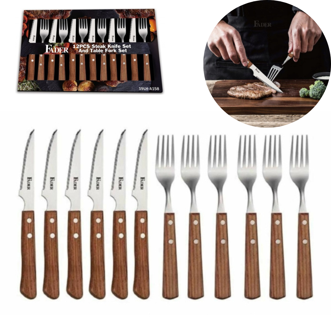 Iekļauts nazis ar zobiem (6gab) un dakšas (6gab).