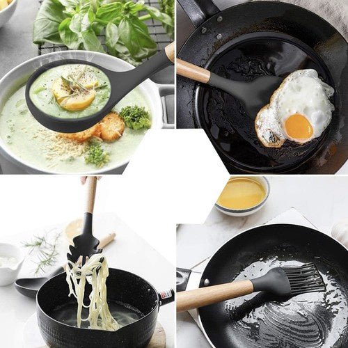 11 silikona virtuves piederumu komplekts statīvā, liels komplekts – viss komplekts sastāv no 12 elementiem. 11 piederumi un notecināšanas trauks. Katrs rīks tiek izmantots citam mērķim. Komplektā ietilpst lāpstiņas, kausiņi, makaronu liekšķere, putotājs, karotes, knaibles un birste. Izturīgs pret silikonu pret temperatūrām – ir vērts atcerēties, ka silikona virtuves piederumi ir izturīgi pret augstām temperatūrām, maksimālā temperatūra, kurā piederumus var lietot, ir līdz 230 grādiem. Elastīgs un delikāts – silikons ir elastīgs materiāls, kas nesaskrāpē trauku vai pannu virsmu. Silikona piederumi ir saudzīgi pret trauku, katlu un pannu pārklājumiem, nesaskrāpē un nebojā virsmas. Izturīgs – silikons ir ļoti izturīgs materiāls, kas padara mūsu piederumus izturīgus pret mehāniskiem bojājumiem, viegli tīrāmus un ilgi kalpojošus lietošanā. Tie nelūzt, nedeformējas un neizbalē. Specifikācija – krāsa: melna – bēša; materiāls: koka silikons; trauka izmēri: augstums: 16 cm; diametrs 12 cm; ierīces garums: 32–26 cm; svars: 827 g; Svars iepakojumā: 953 g. Specifikācija Krāsa: melna - bēša Materiāls: koks Silikona trauka izmēri: augstums: 16 cm, diametrs: 12 cm Ierīces garums: 32 - 26 cm Svars: 827 g Svars iepakojumā: 953 g Komplektā lāpstiņa ar caurumiem Lāpstiņa Kūkas lāpstiņa Lāpstiņa ar noapaļotām malām Karote Putu karote ar caurumiem Makaronu karote Birste Knaibles Kauss Putotājs Notecināšanas trauciņš Galda piederumu trauks Silikona virtuves piederumu komplekts ir praktiska un funkcionāla izvēle katram pavāram. Silikona piederumi ir viegli tīrāmi, izturīgi pret augstām temperatūrām un nepiedegoši, tāpēc tos ir viegli lietot dažādās virtuves situācijās. Brīdinājums par saturu: -Lietot paredzētajam mērķim. -Pēc katras lietošanas reizes rūpīgi nomazgāt virtuves piederumus. -Uzglabāt virtuves piederumus sausā vietā, lai novērstu to koroziju vai pelējuma veidošanos.