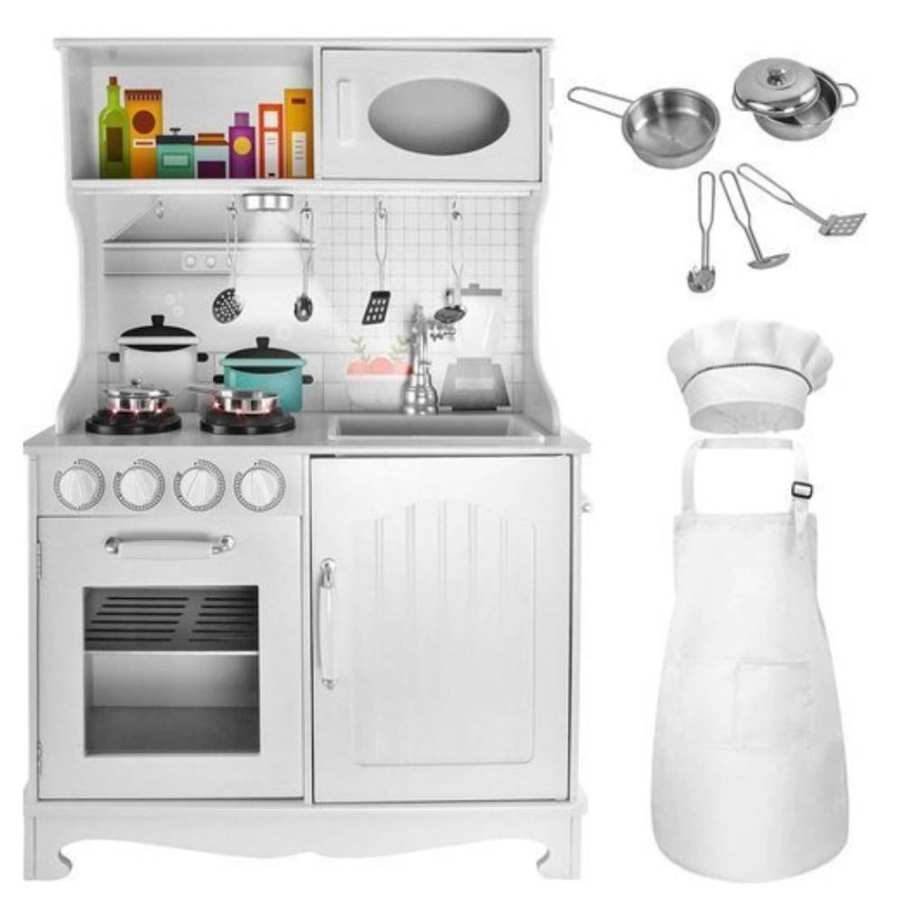 Komplektā jūs saņemsiet pavāra cepuri, priekšautu, 4 karotes, katlu, pannu un vāku. Šefpavāra apģērbs ir ērts un realistisks. Izlietne ir noņemama.