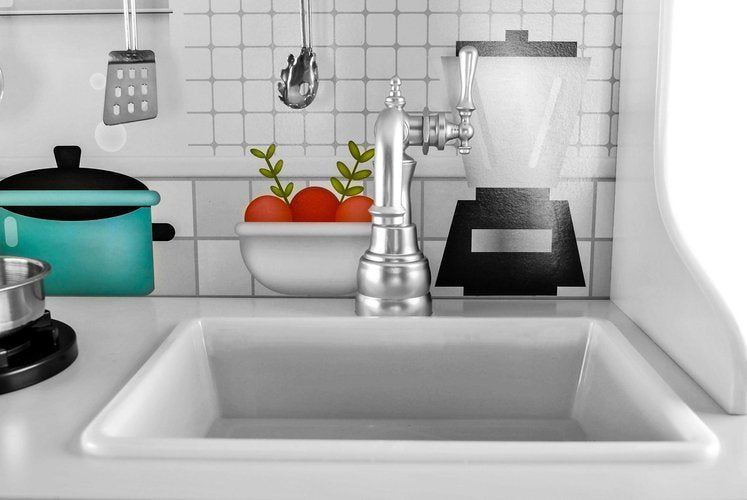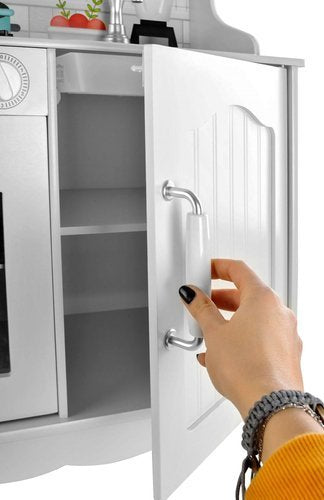 Mūsu koka virtuves komplektā ir iekļautas skaņas un apgaismojuma funkcijas, kas nodrošina daudz jautrības. Komplektā nāk gaismeklis, kuru var likt jebkur – zem